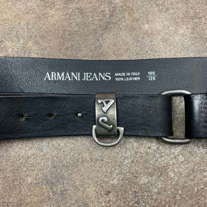 Vintage Armani belt with AJ logo detailing on the carabiner loop, coloured black all over and in excellent second hand condition with little wear from age as shown. Could easily add holes to fit a smaller waist.