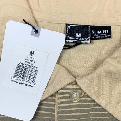 Vintage Oakley polo with embroidered spell out logos front and back, a print across the top of the front, cut and sewn panelling on the torso, coloured cream all over and brand new with tags.