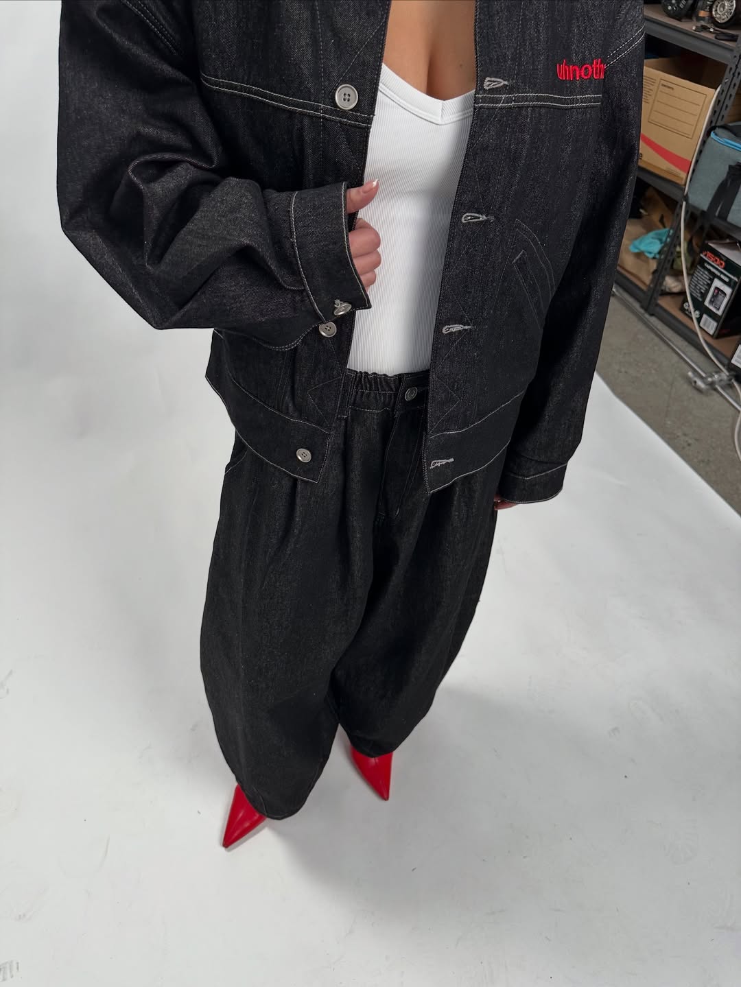 This baggy-sleeve denim jacket is made from lightweight, flowy 100% cotton denim (330 GSM). Finished with draping into our signature red leather patch on the back.