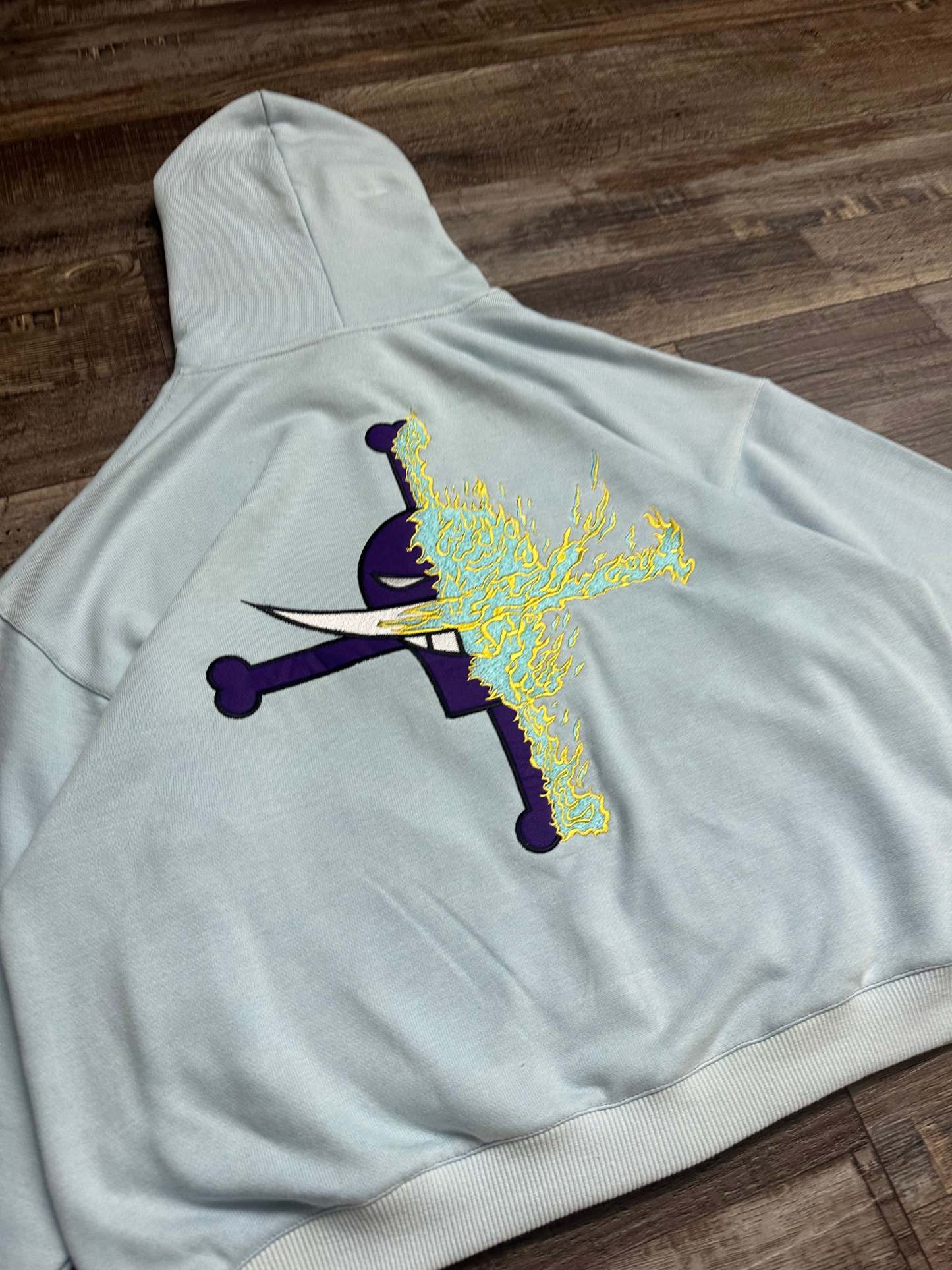 Back embroidery of flaming sword and pirate emblem