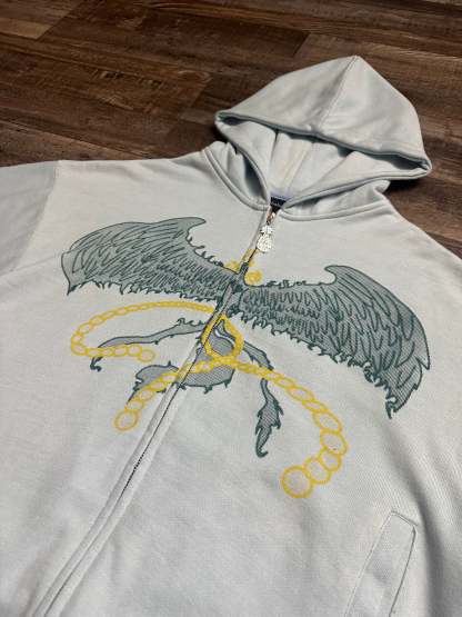 Front embroidery of wings and flame chains