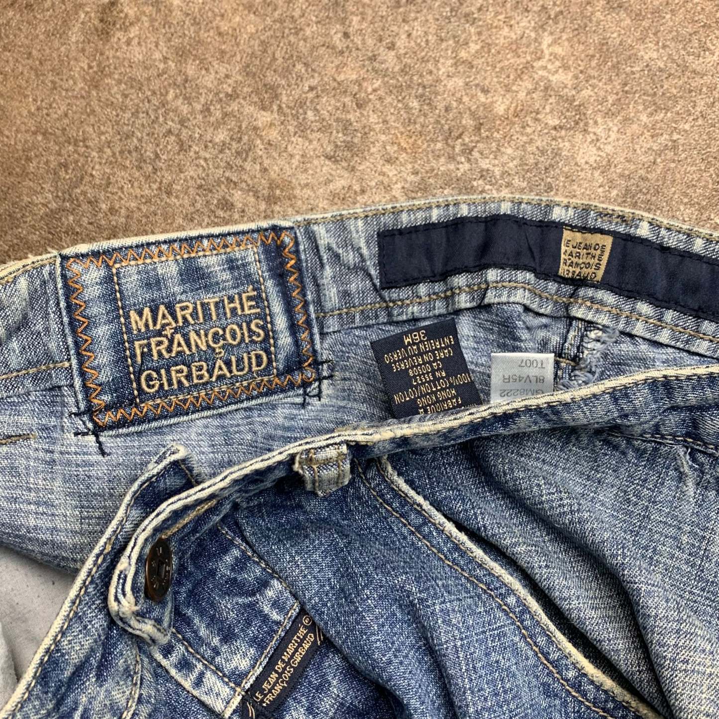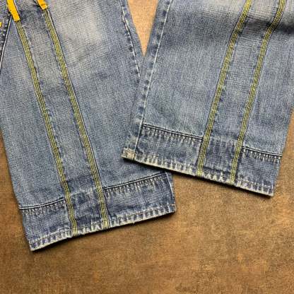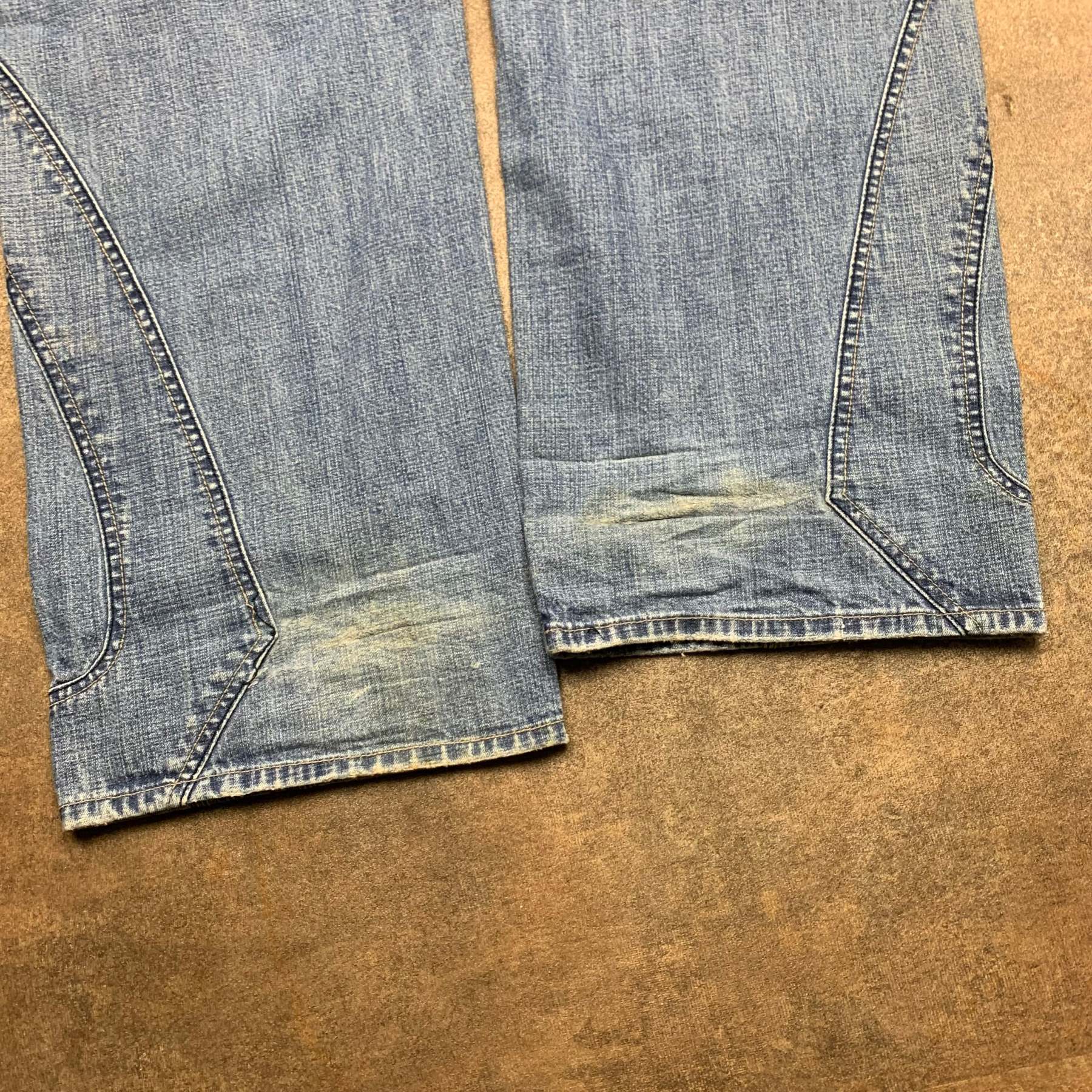 Super rare M+FG jeans with cut and sewn graphics on the front / sides of both legs, embroidered branding on the front / top of the back, coloured washed blue all over, baggy fit and in great second hand condition with marks as shown.