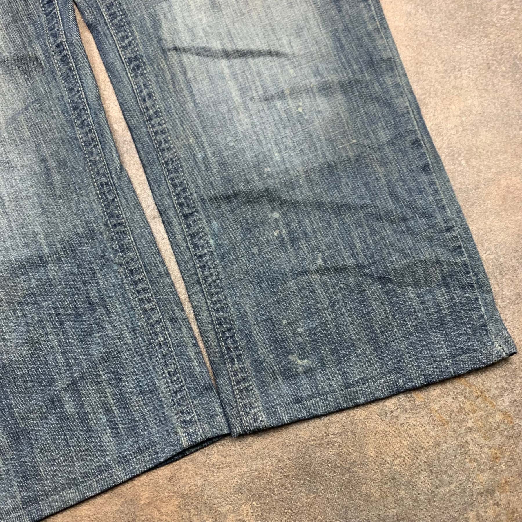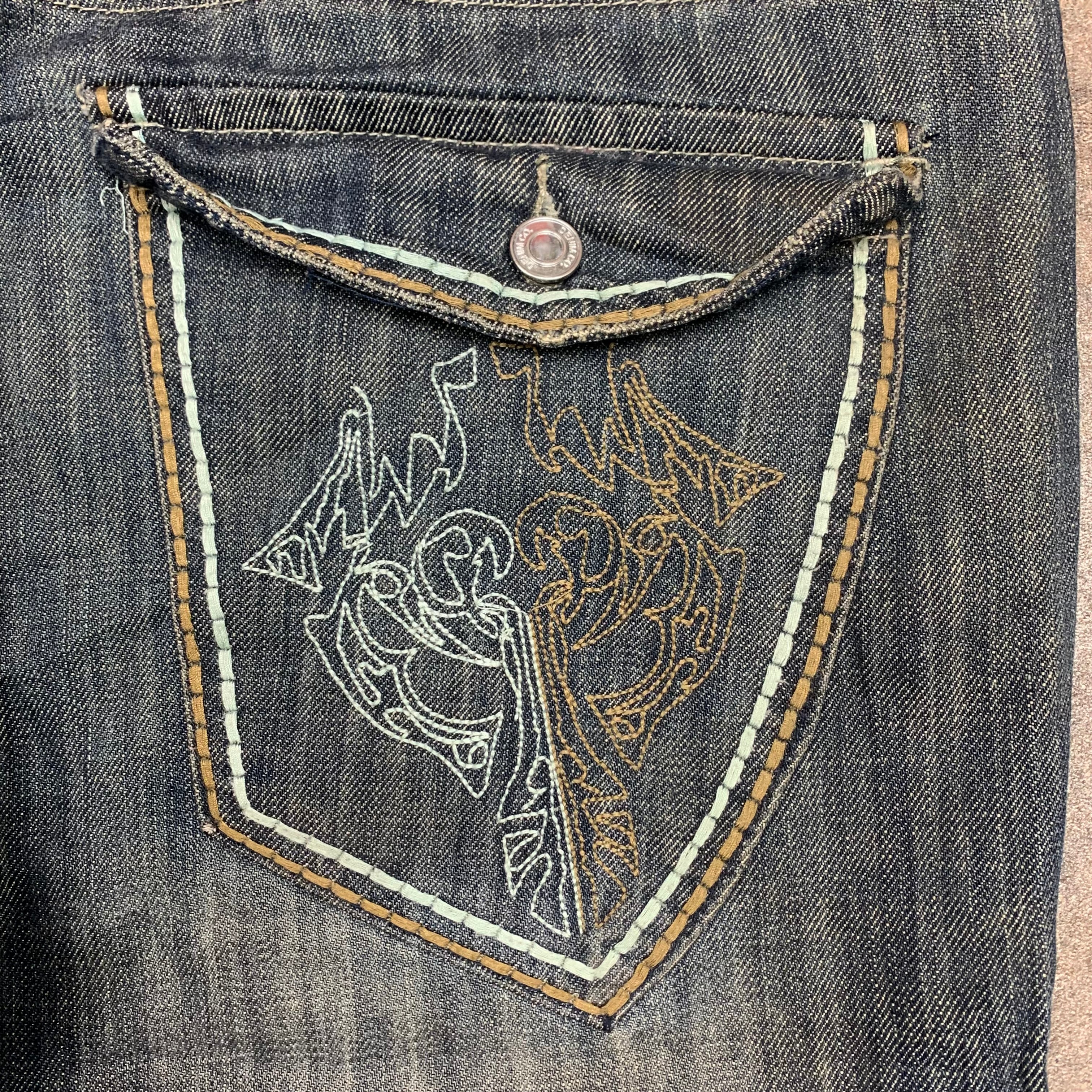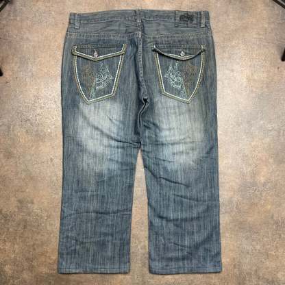Vintage short jeans with embroidered graphics on the back pockets, baggy / flared fit, coloured washed navy and in good second hand conditon with wear as shown / taken up at the hem.