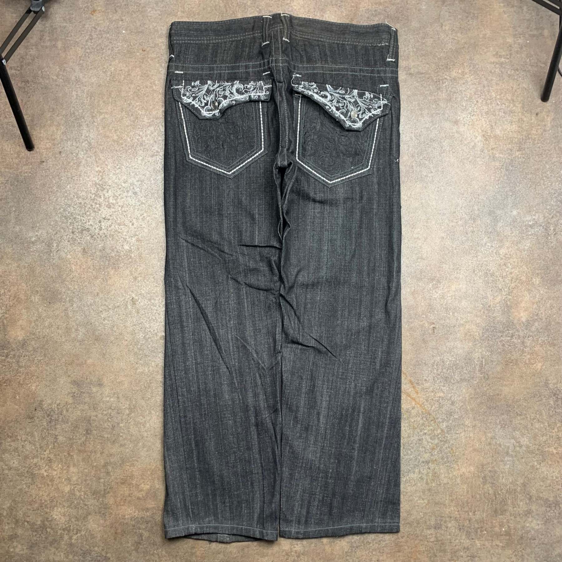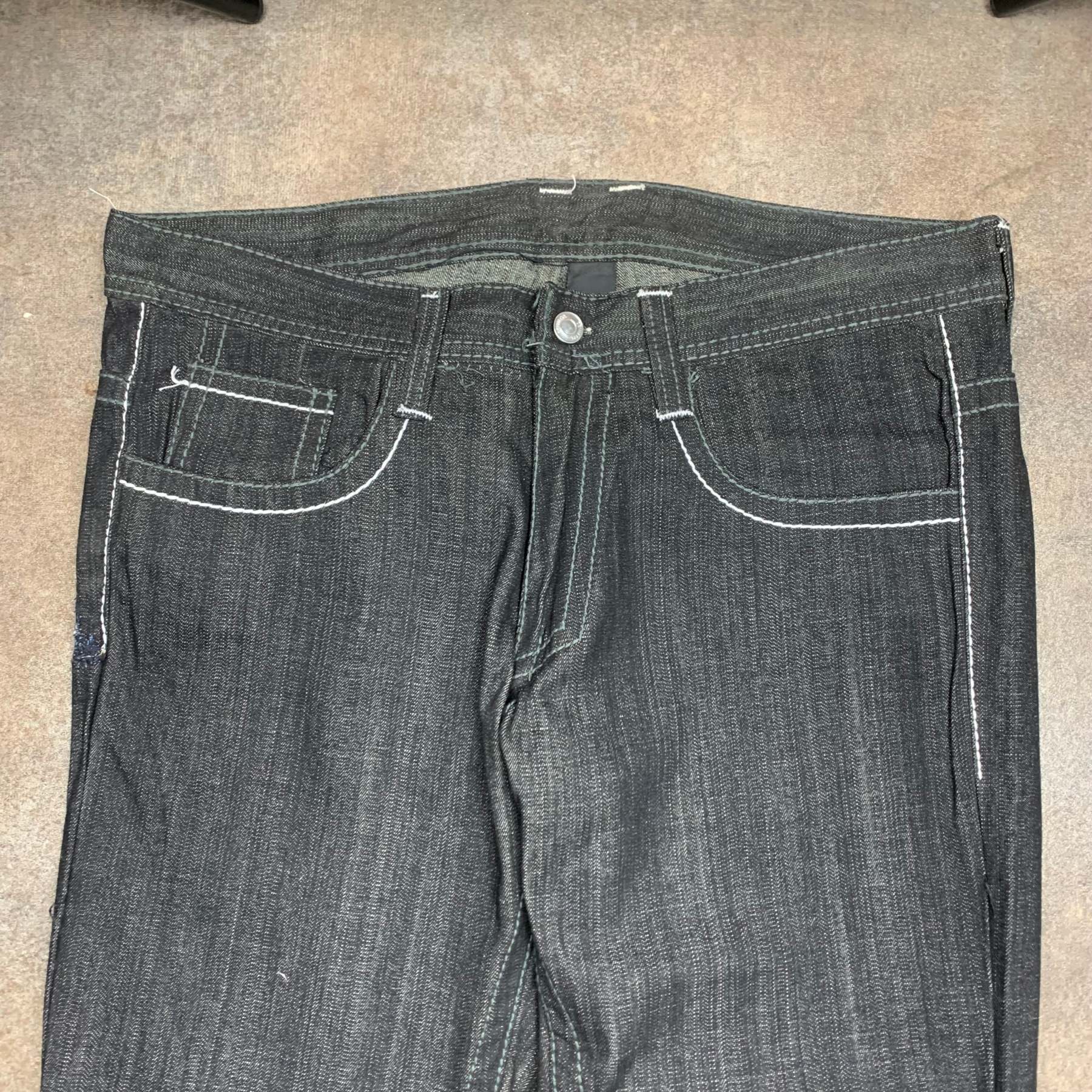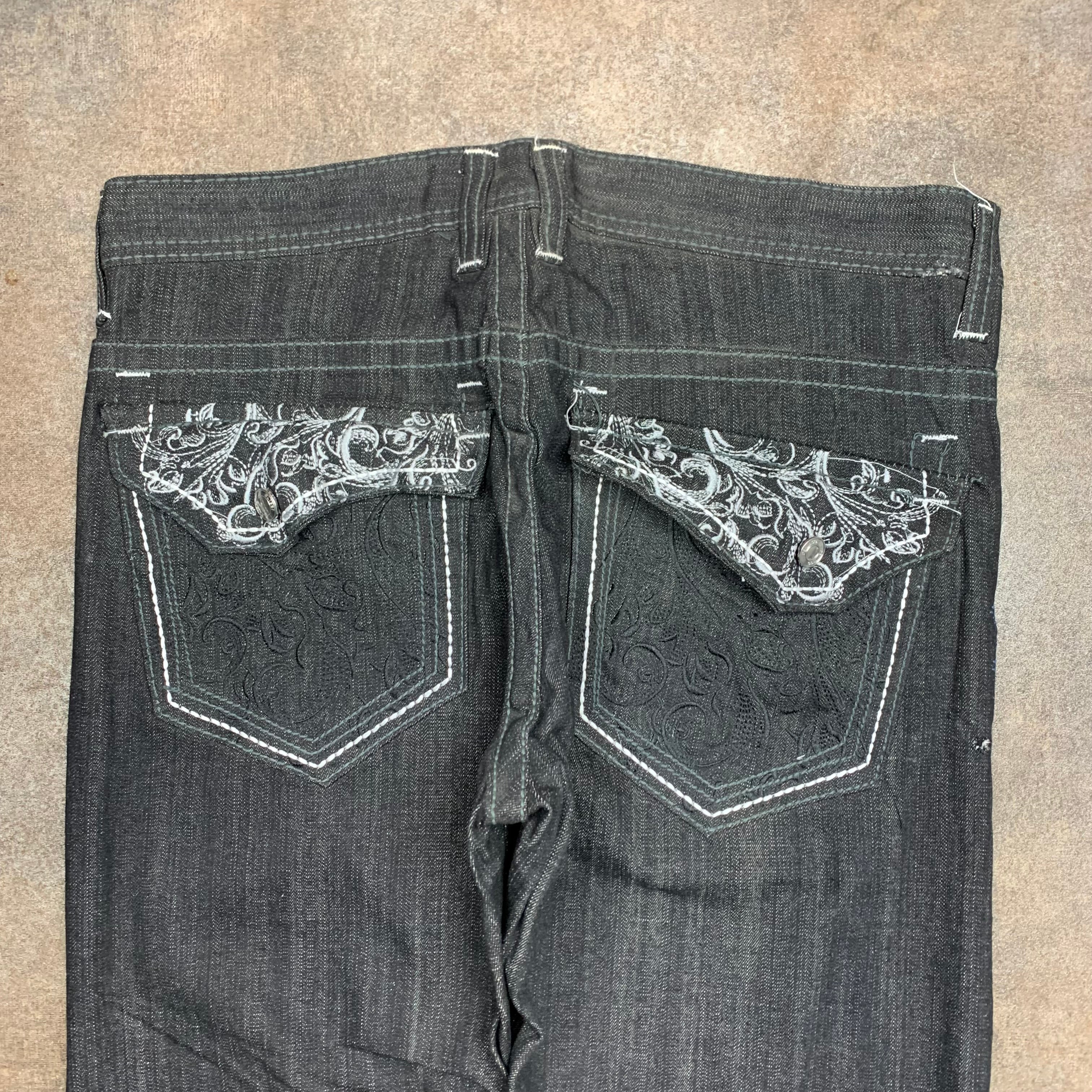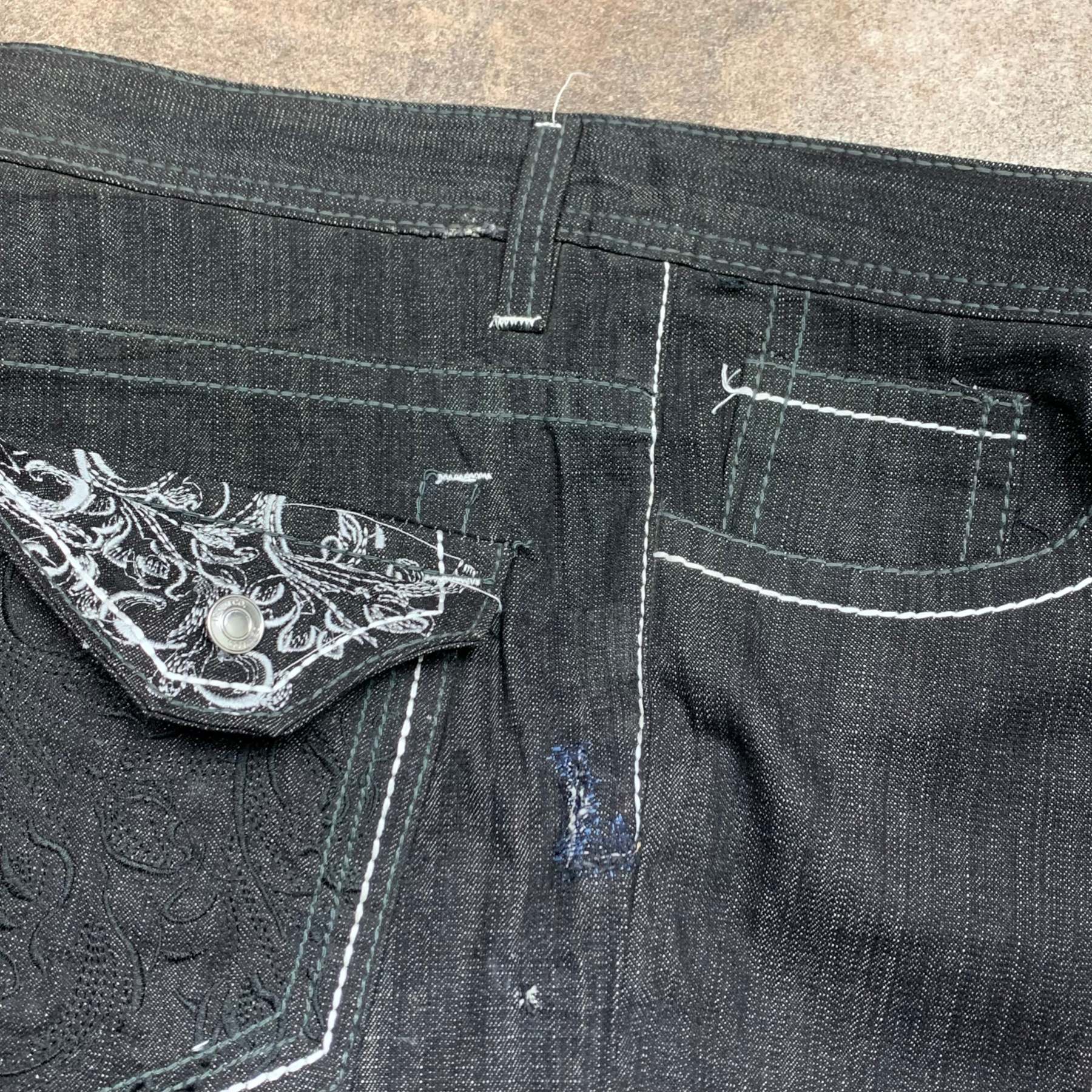 Rare Southpole factory defects with white / black tribal embroidery on the back pockets, coloured black all over, in a baggy / wide leg fitand in great second hand condition with a repair on the side / factory defect issues as shown i.e missing buttons and label.
