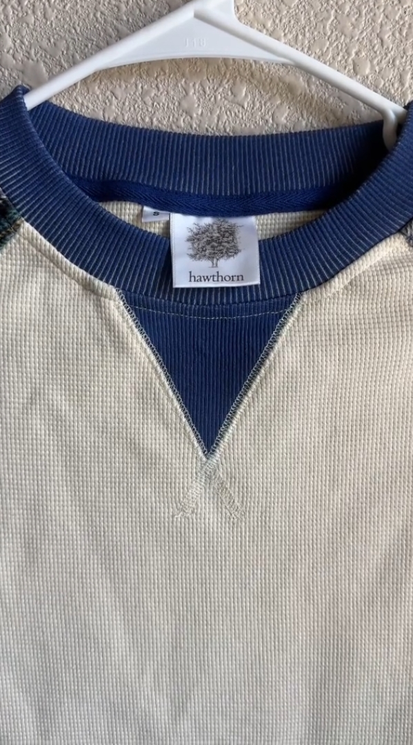Classic workwear texture meets laid-back prep style. This long sleeve features a cozy waffle-knit body in a neutral cream tone, perfectly contrasted with bold plaid check sleeves in navy and green. Finished with ribbed blue collar, cuffs, and signature V-insert detail at the neck for vintage athletic vibes.