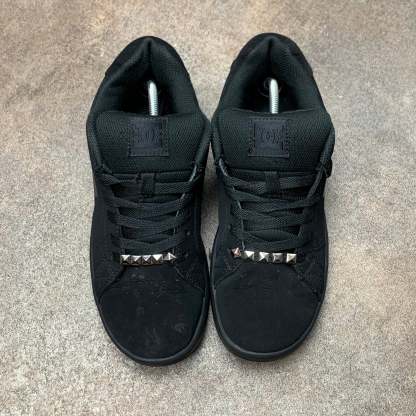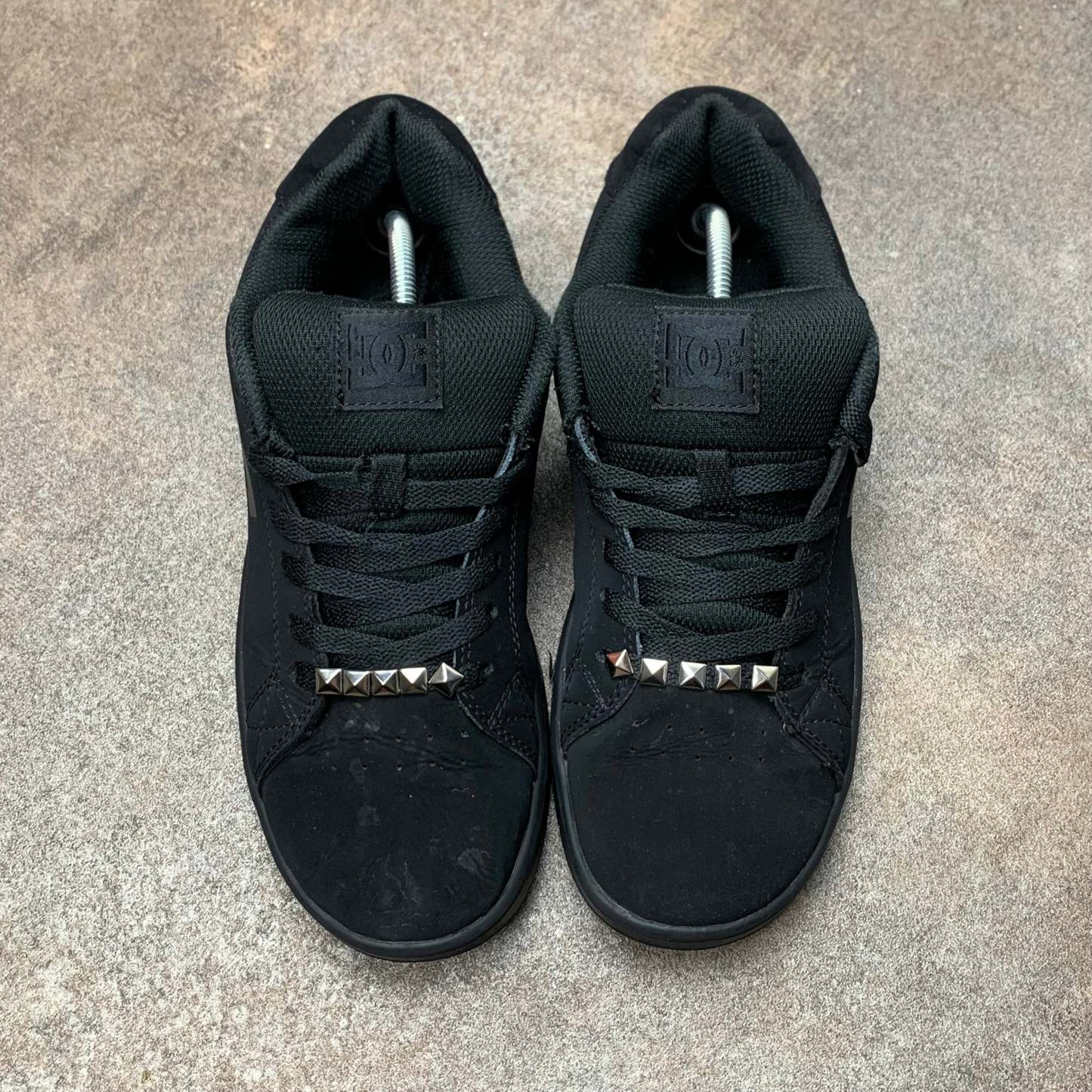 Grunge style pair of DC shoes with pyramid studs on the laces, big star logos on the sides and tongue, coloured black all over and in excellent second hand condition with faint marks as shown / comes in a DC box (box isn't for this make of shoe).