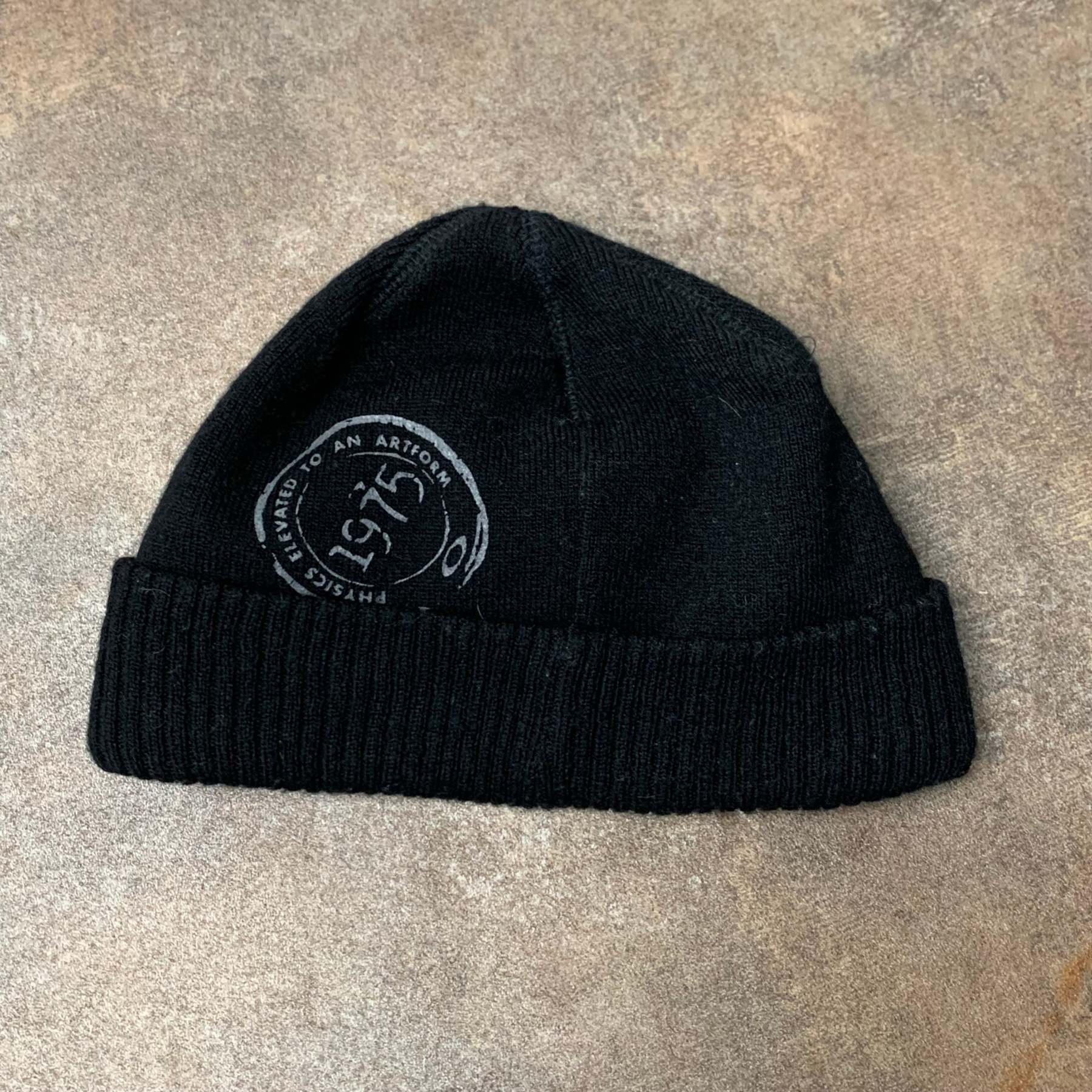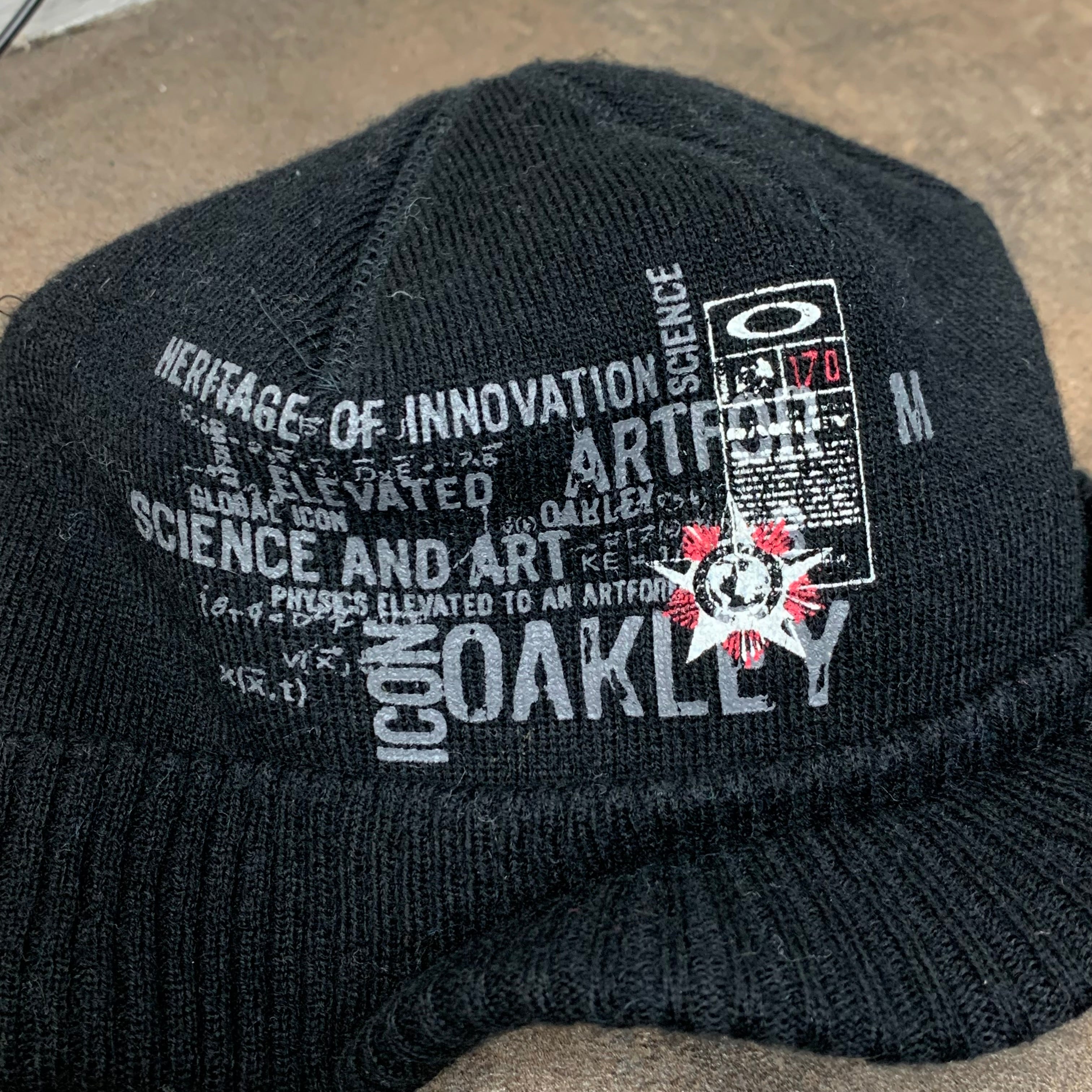 Vintage Science and Art Oakley beanie cap with grey printed graphics front and back, coloured black all over, lined inside and in excellent second hand condition with minimal wear.
