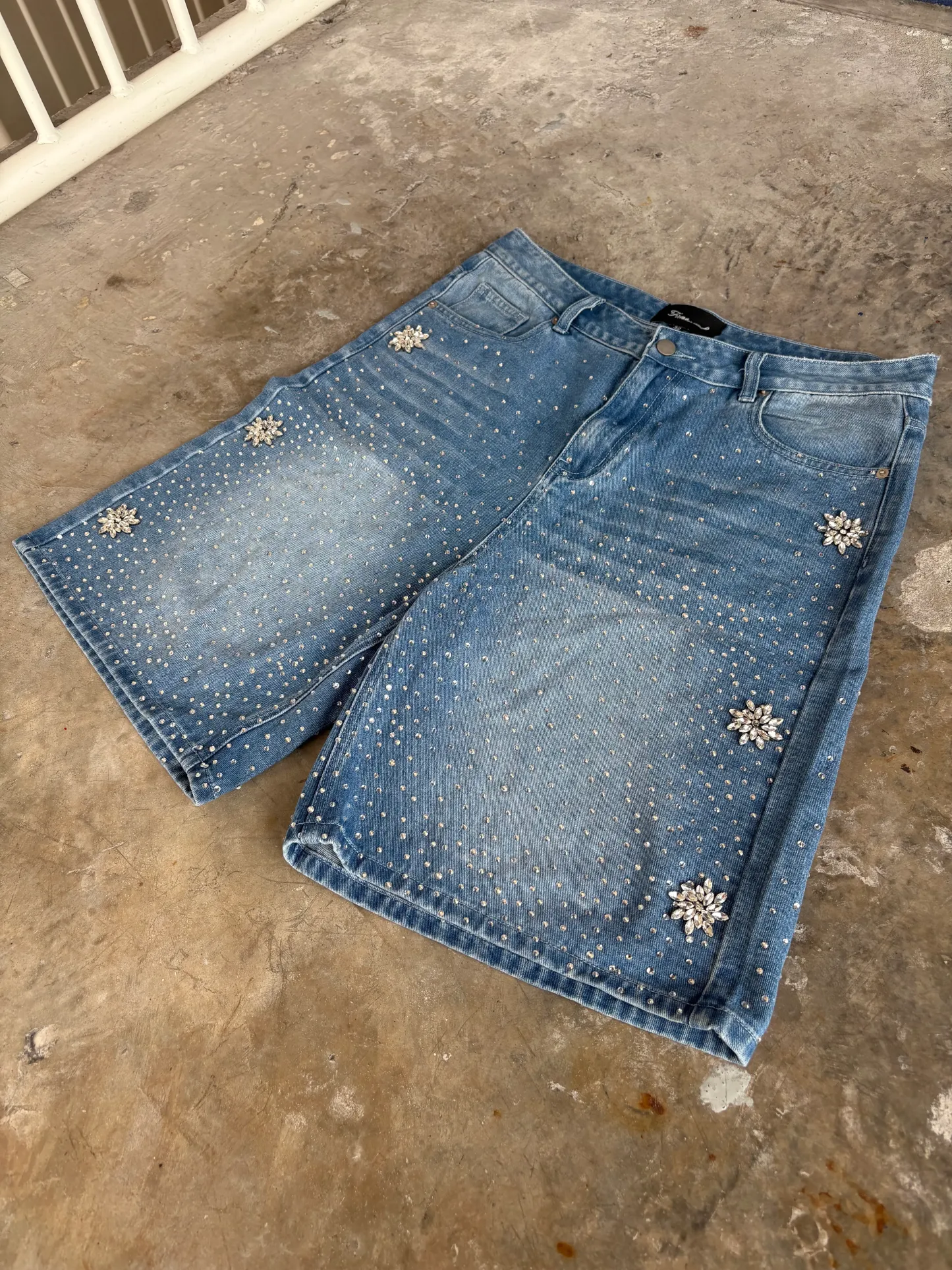 These 18oz denim jorts are fully flooded with rhinestones for a bold, dazzling look.