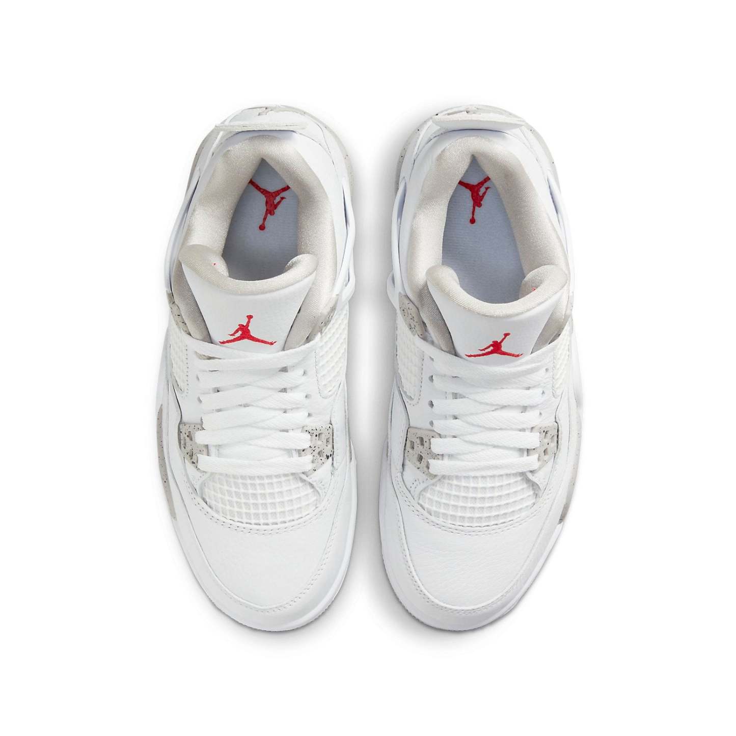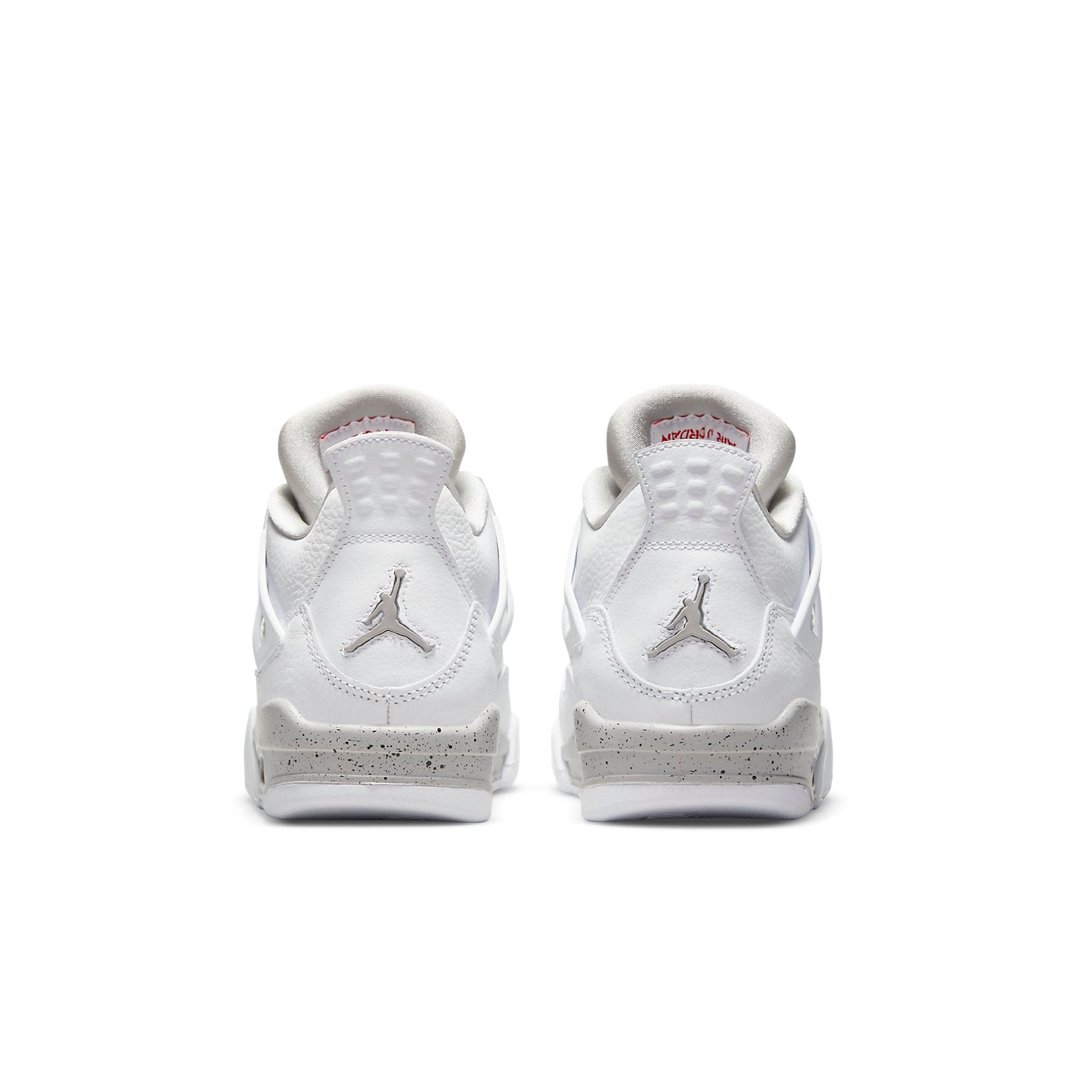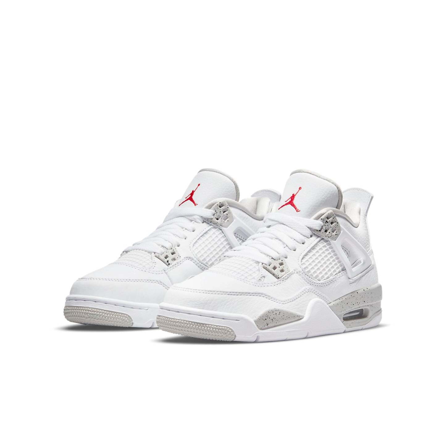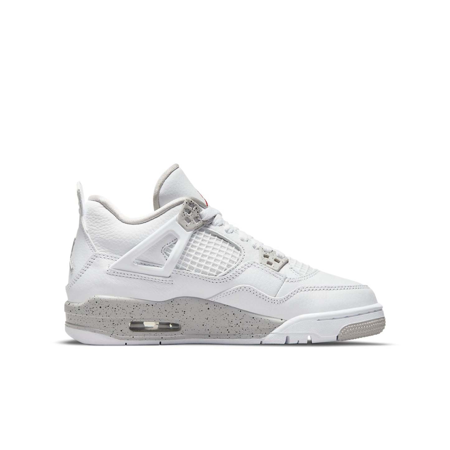 The Air Jordan 4 Retro GS ‘White Oreo’ is an updated colorway of the classic silhouette that MJ wore when he famously sank ‘the shot’ in the first round of the 1989 NBA Playoffs. This sneaker is perfect for big kids, and is constructed from white tumbled leather with grey Jumpman branding on the heel. The same grey finish is applied to the sneaker’s molded eyelets and foam midsole, with both components covered in black speckled detailing. Atop the white leather tongue, an embroidered Jumpman icon in Fire Red delivers a contrasting pop of color.