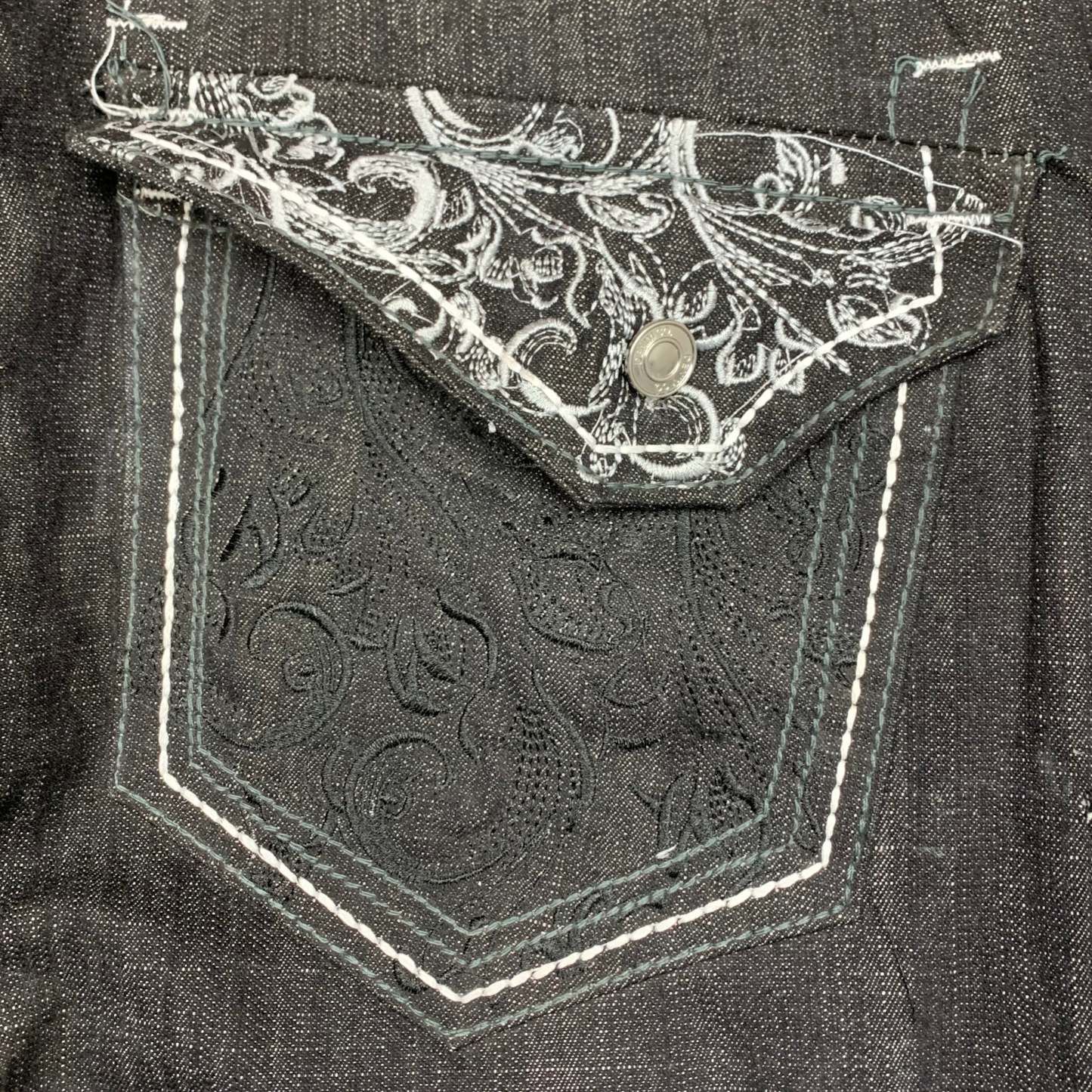 Rare Southpole factory defects with white / black tribal embroidery on the back pockets, coloured black all over, in a baggy / wide leg fitand in great second hand condition with a repair on the side / factory defect issues as shown i.e missing buttons and label.