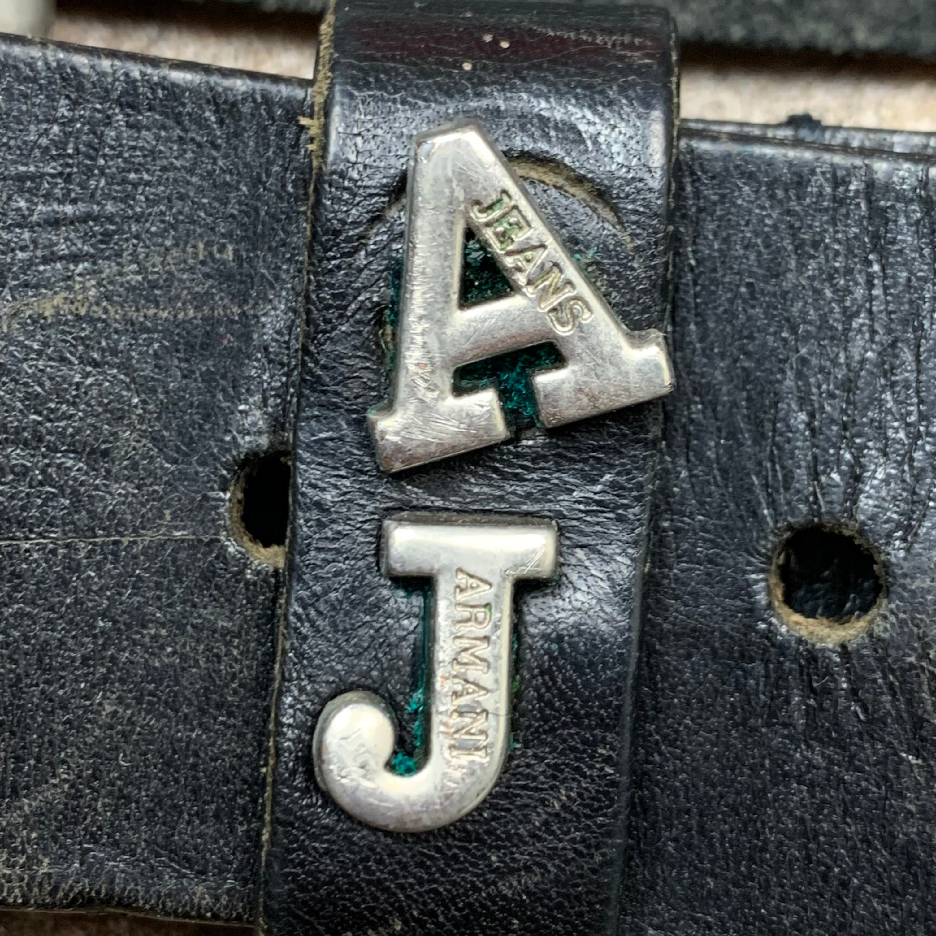 Rare Armani belt with AJ detailing on the belt loop, spellouts on the buckle, coloured black all over and in excellent second hand condition with some marks around the holes as shown / rust from age as shown, virtually unnoticeable when worn.