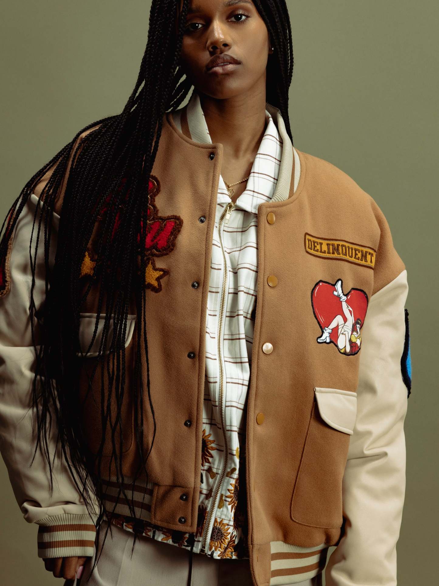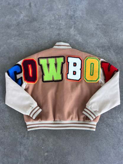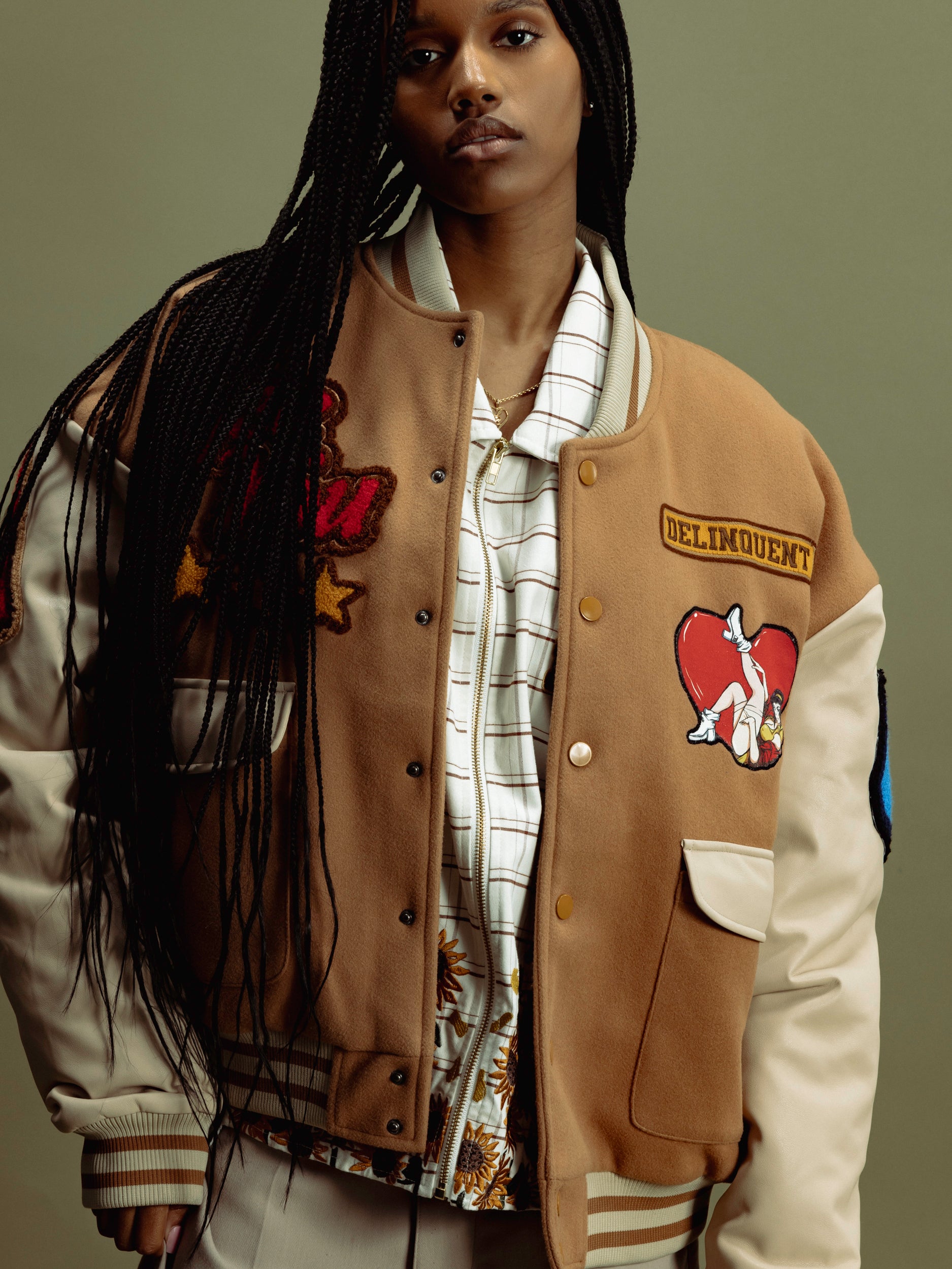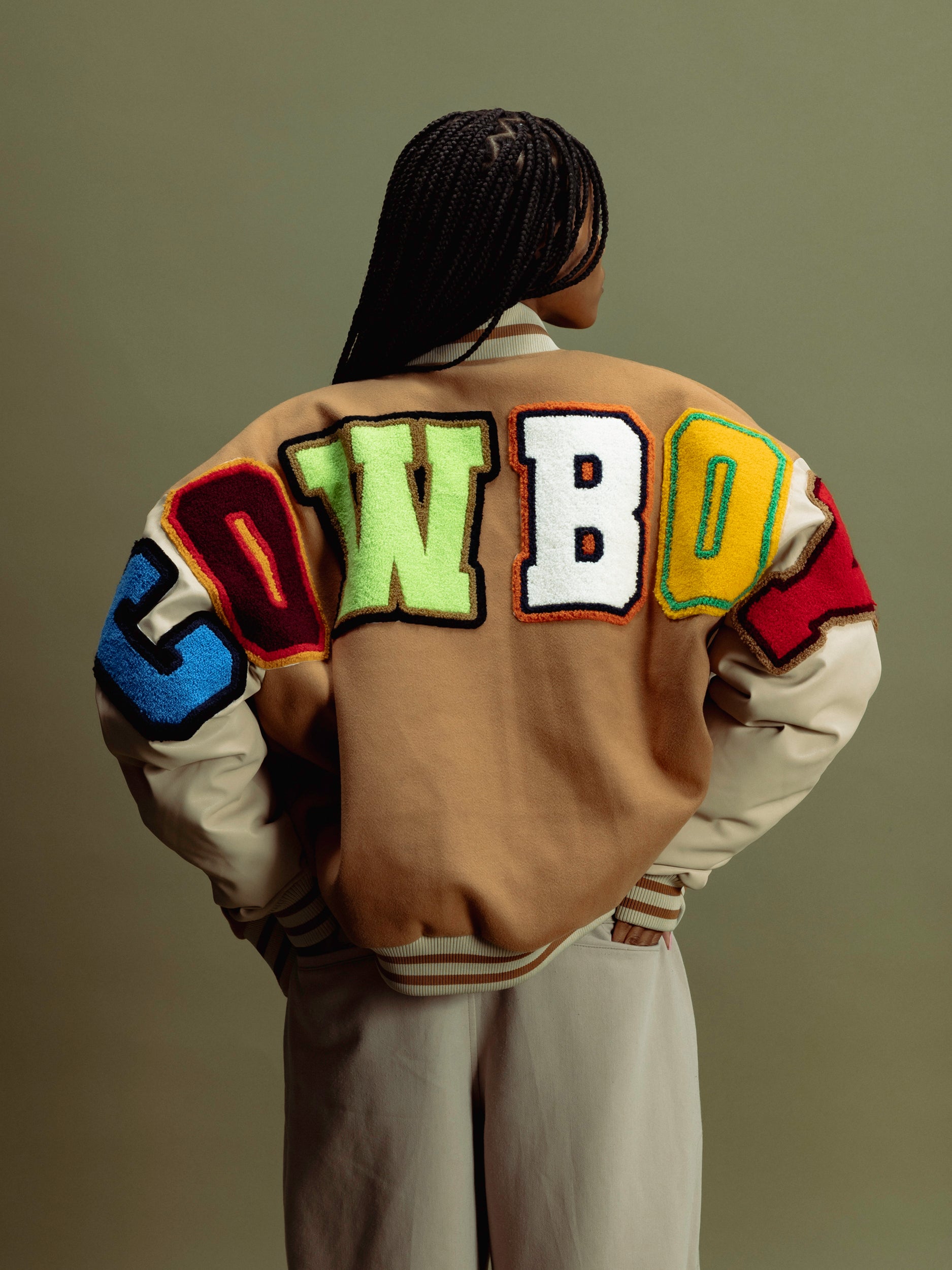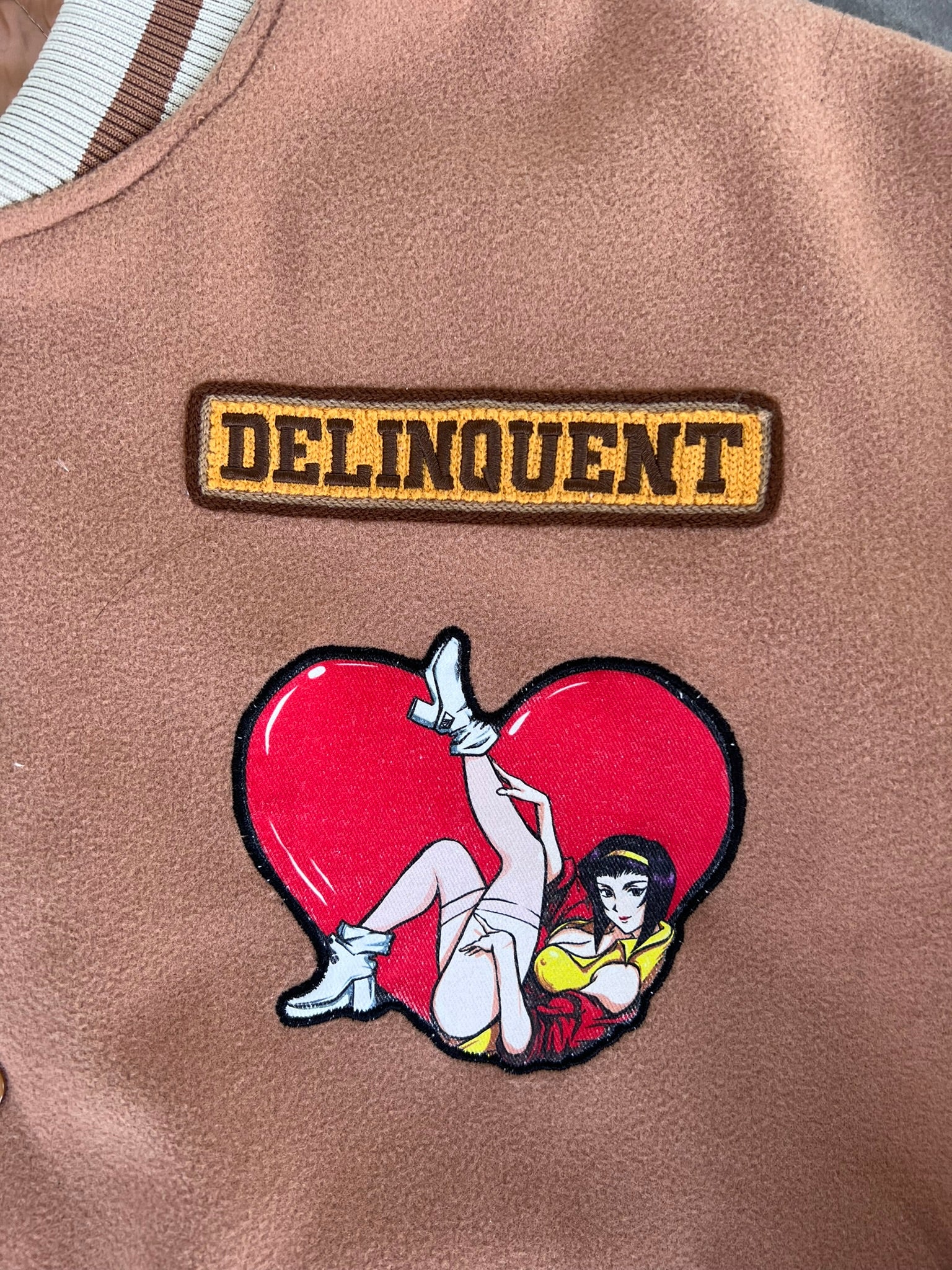 An iconic anime made into a neutral yet playful design. Represent the alluring nature of Faye Valentine with this jock jacket blending cream colors with colorful collages inspired by varsity fonts. Part wool and Vegan Leather with beautiful embroidered finishes.