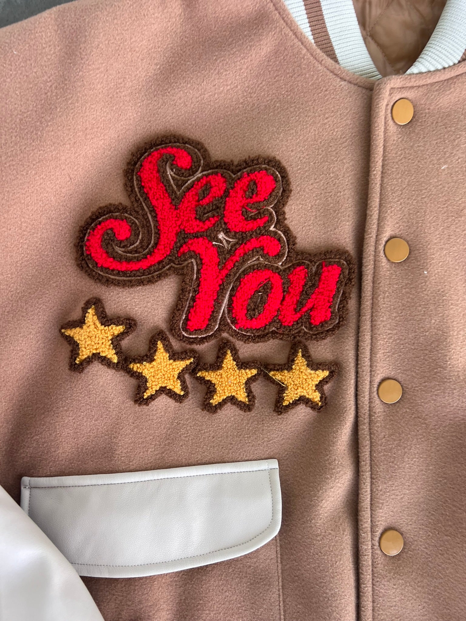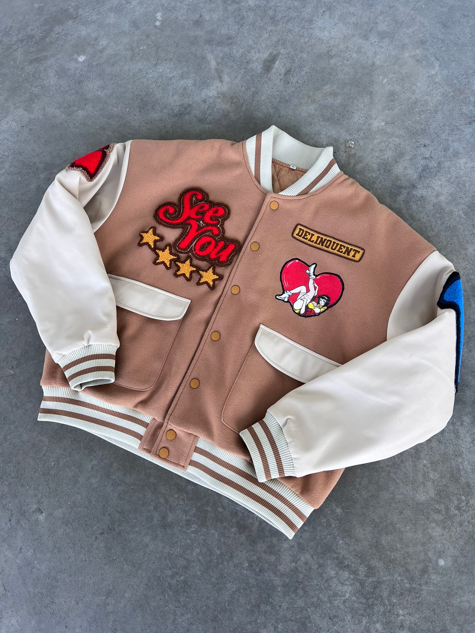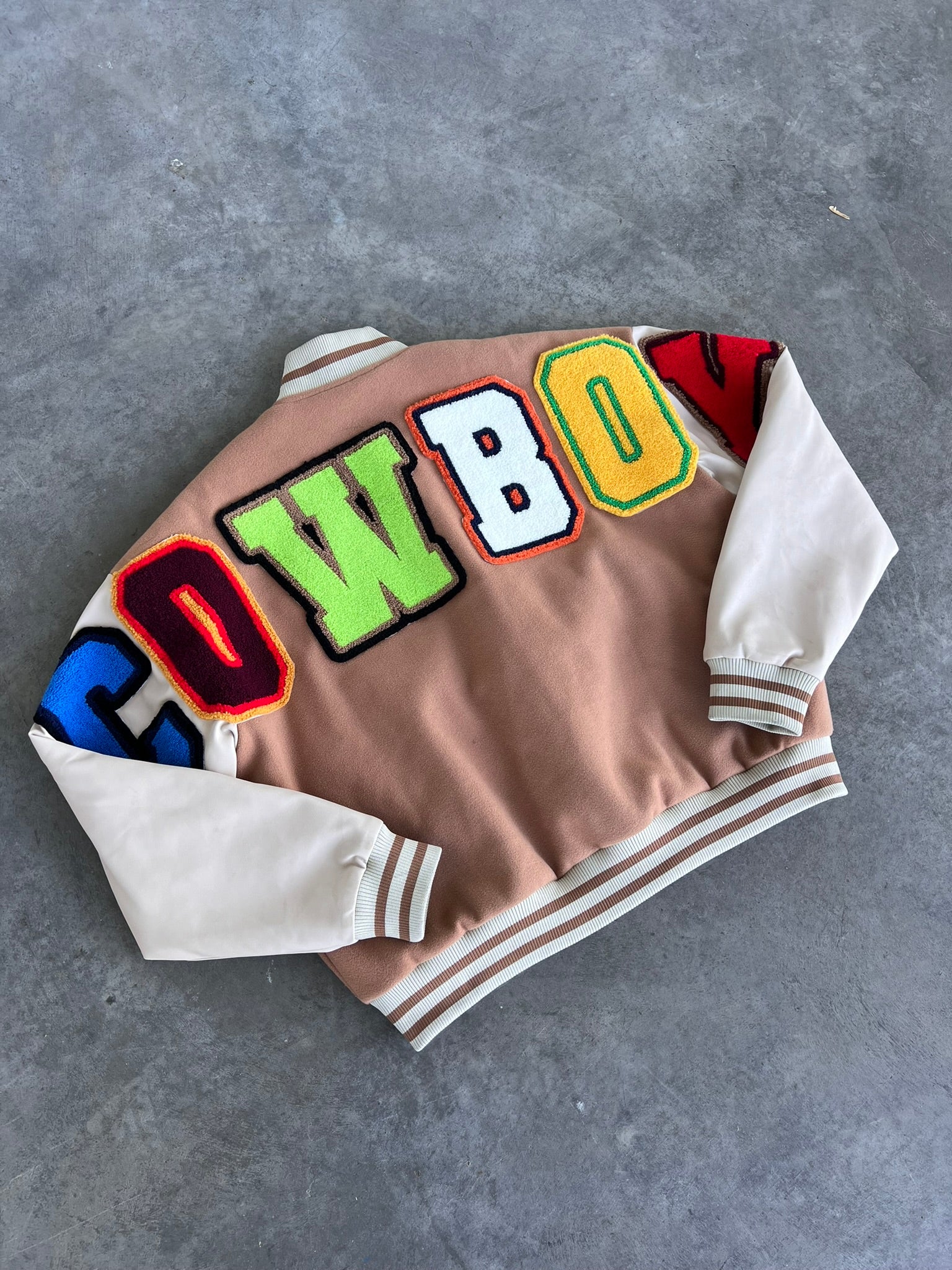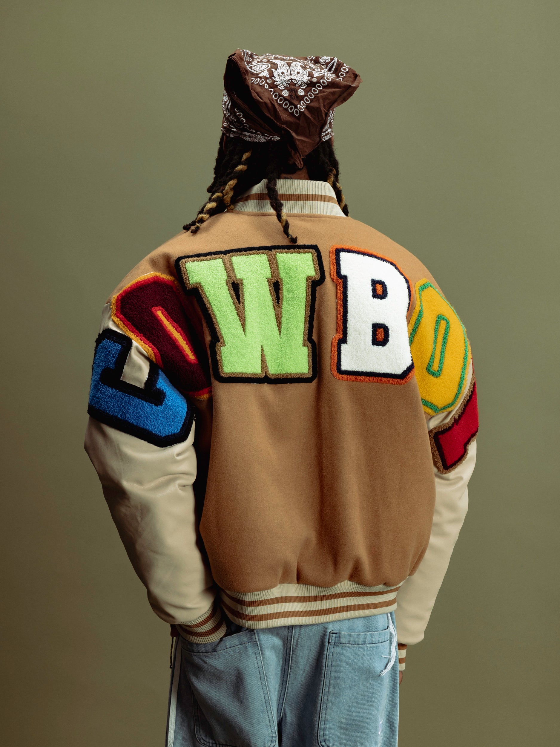 An iconic anime made into a neutral yet playful design. Represent the alluring nature of Faye Valentine with this jock jacket blending cream colors with colorful collages inspired by varsity fonts. Part wool and Vegan Leather with beautiful embroidered finishes.