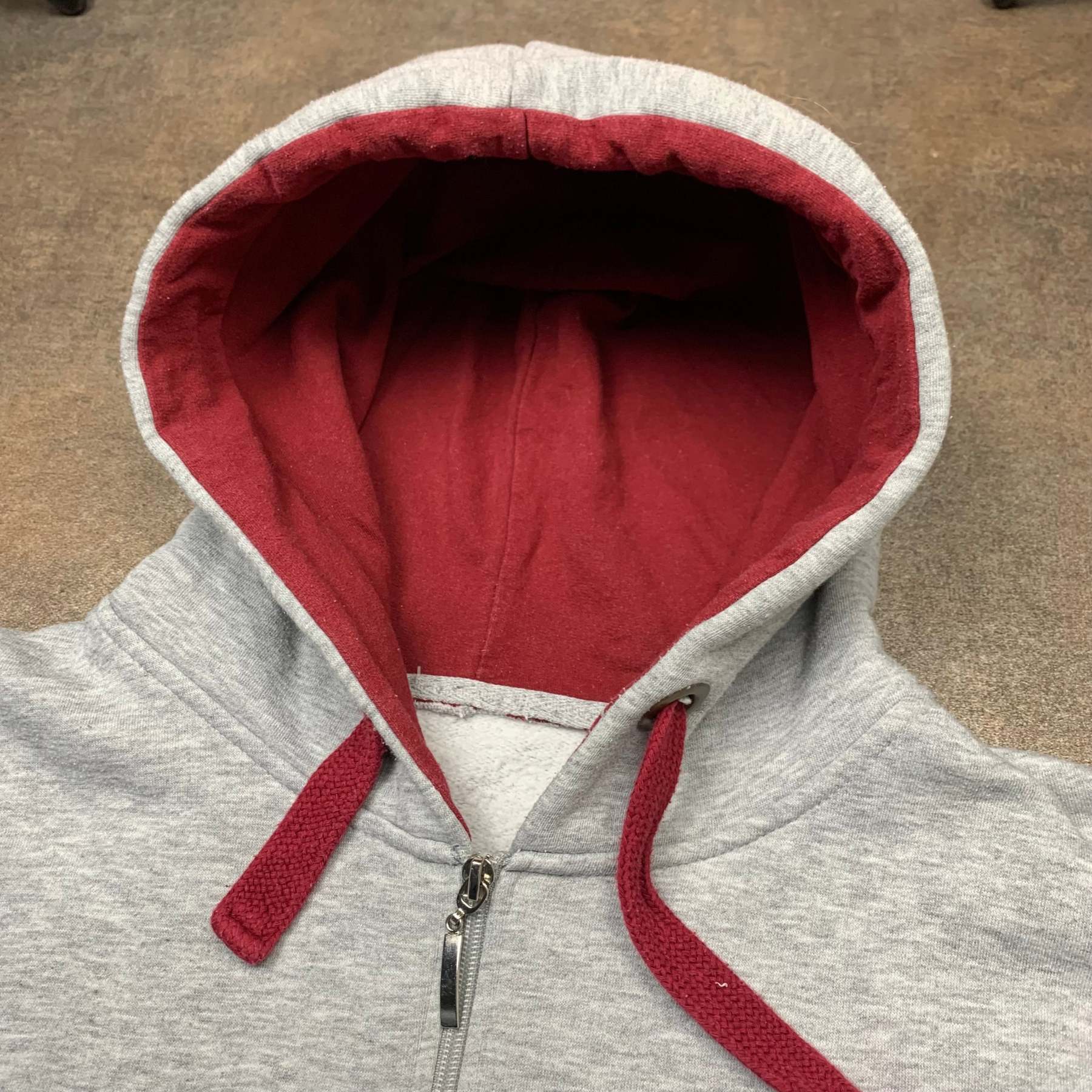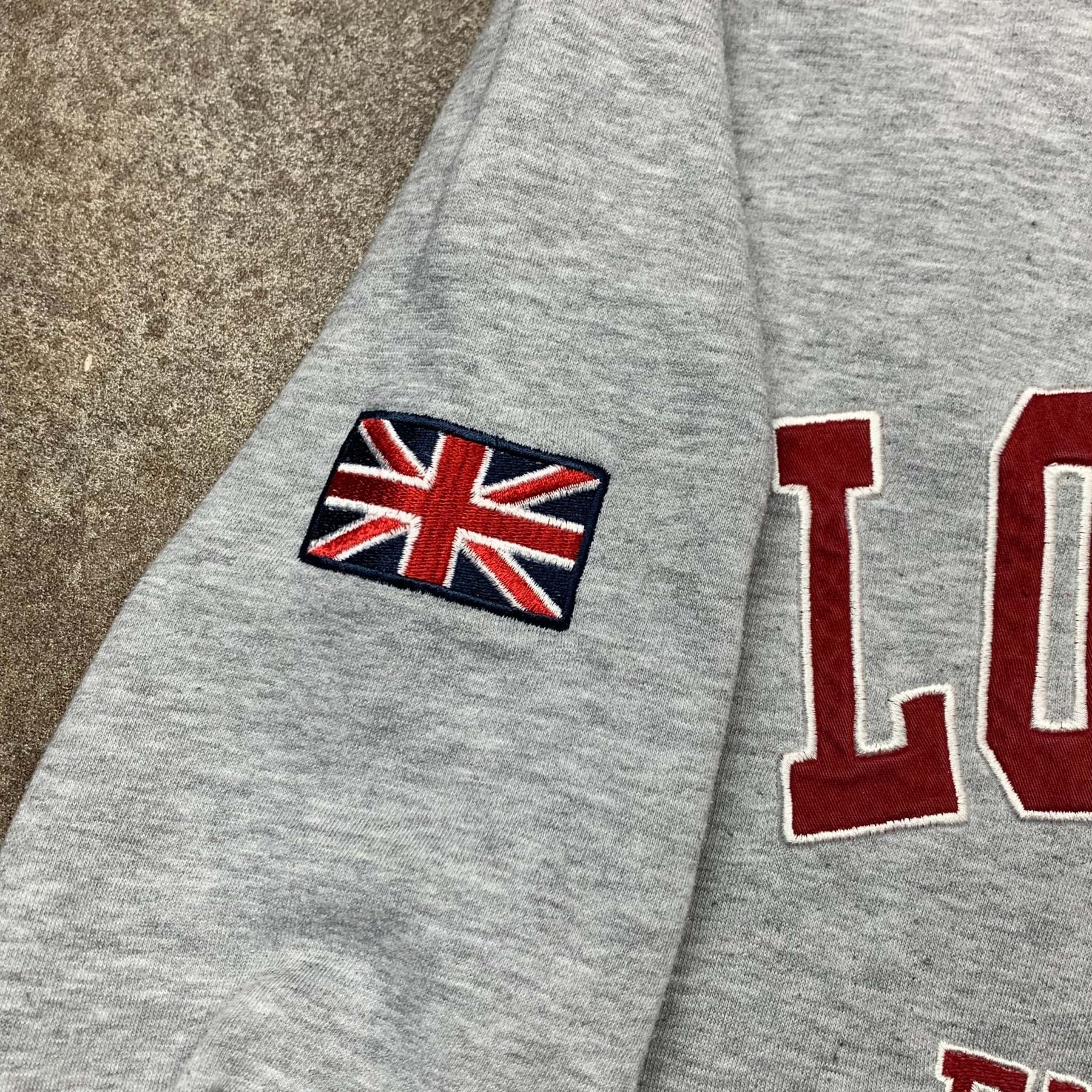 Vintage hoodie with UK / union jack detailing on the front and right sleeve, coloured grey with red accents and in excellent second hand condition with little to no wear.