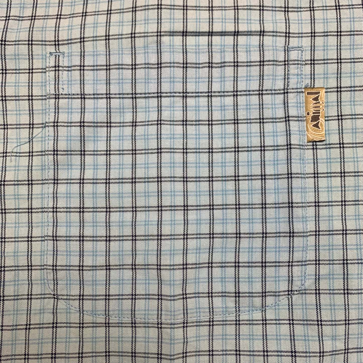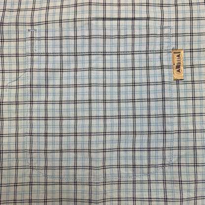90s Animal shirt with a logo tab on the front pocket, plaid pattern all over in blue / white and in good second hand condition with 2 stains the front as shown and bottom button missing.