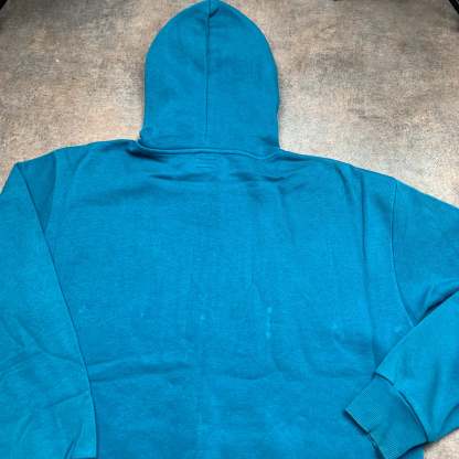 Vintage DC hoodie with a printed big star logo on the front in light blue, coloured blue-teal all over and in excellent second hand condition with unnoticeable discolouration to the cuffs.