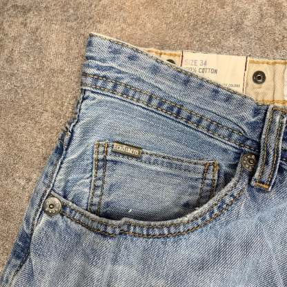 Vintage Ecko jeans with embroidery across the back pockets, a branded tab on the back right pocket / branded jacron, coloured pale blue all over with contrast coloured back pockets and in excellent second hand condition with a repair to the top of the back as shown.