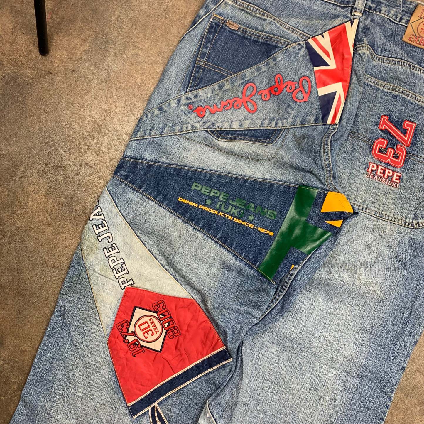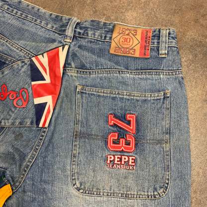 Rare pair of Pepe jeans with embroidered, printed / cut and sewn graphics all over, logo detailed jacron, baggy fit, coloured washed blue with tons of colours throughout, UK flag at the top of the back and in good second hand condiiton with wear / repair as shown.
