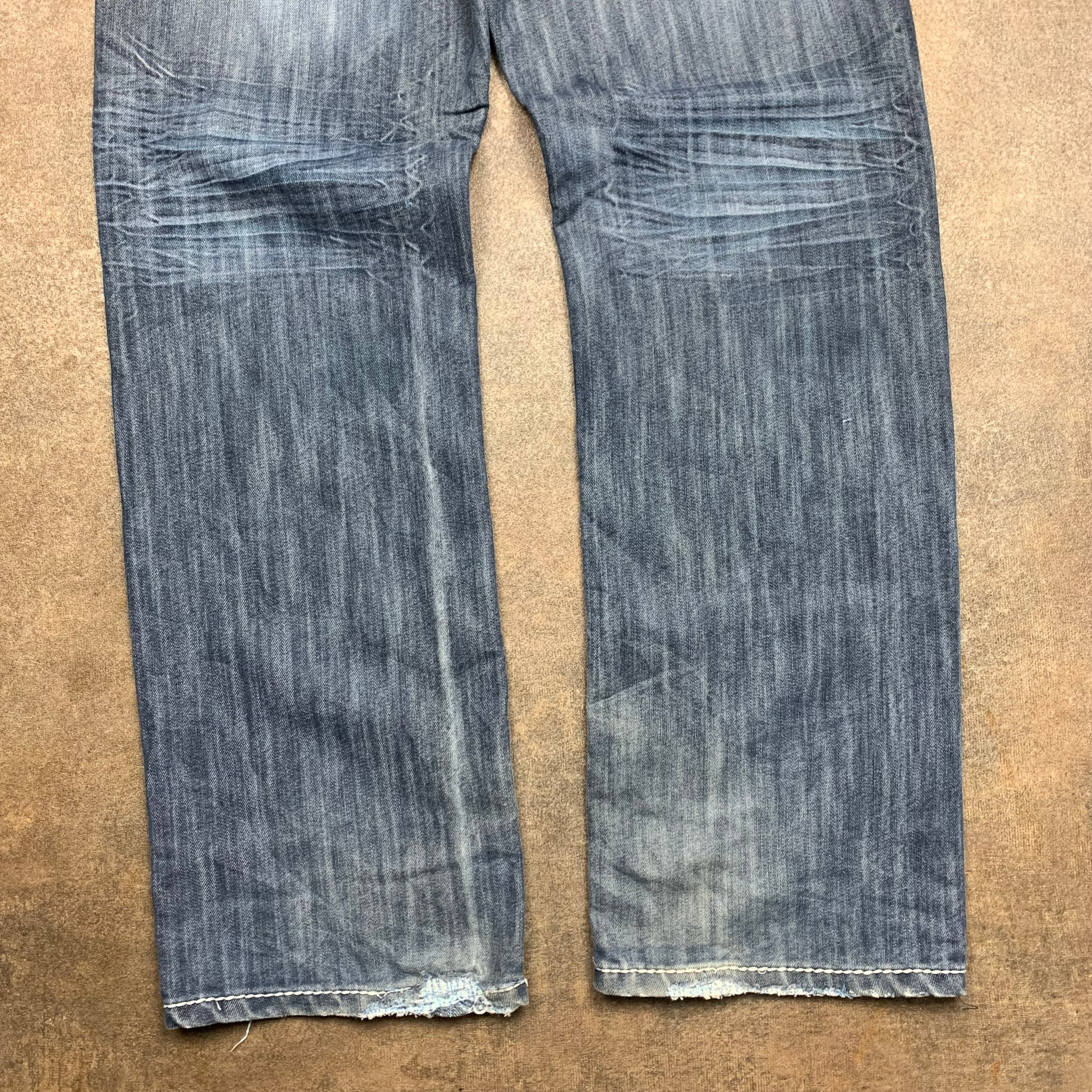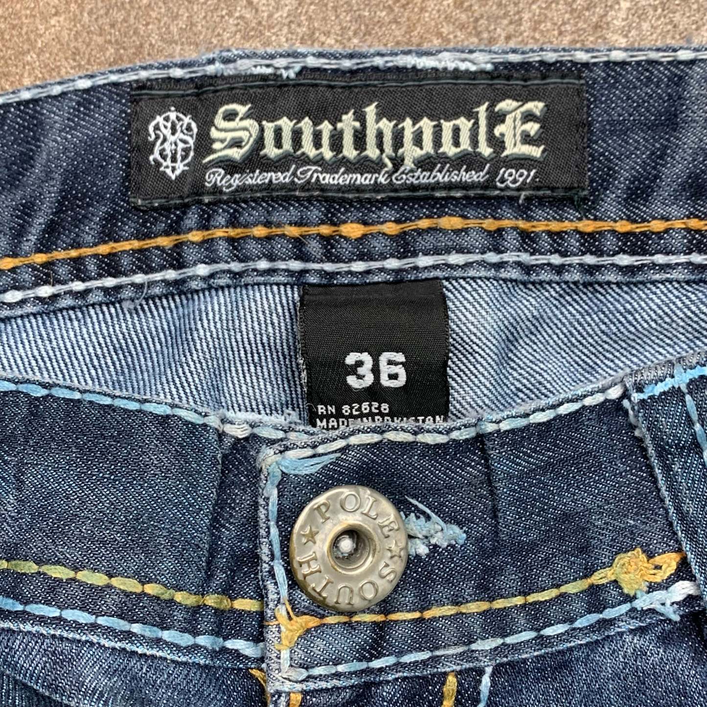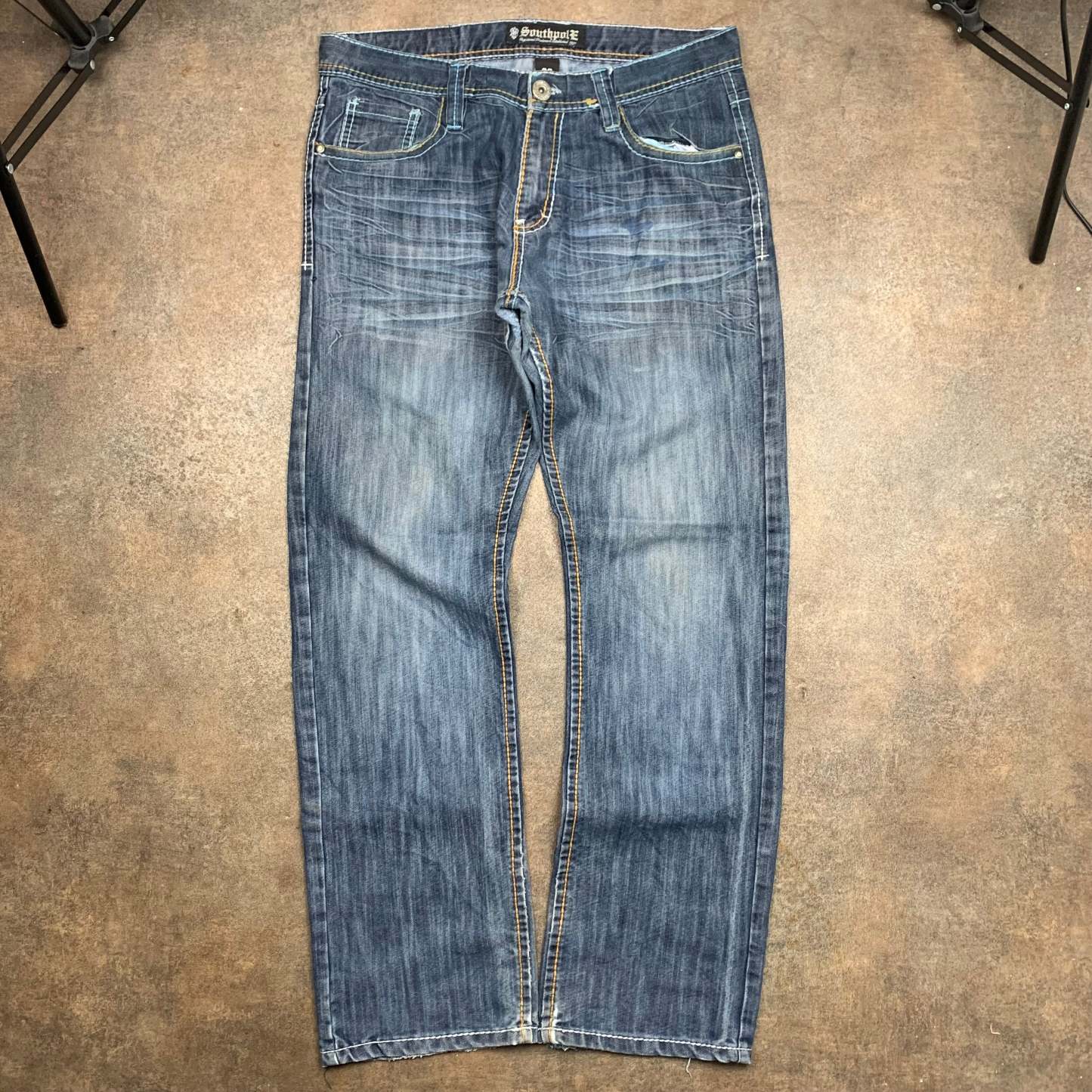 Rare Southpole jeans with embroidery on the back pockets, in a straight leg fit, faded jacron, coloured washed navy all over and in good second hand condition with wear / repair as shown.