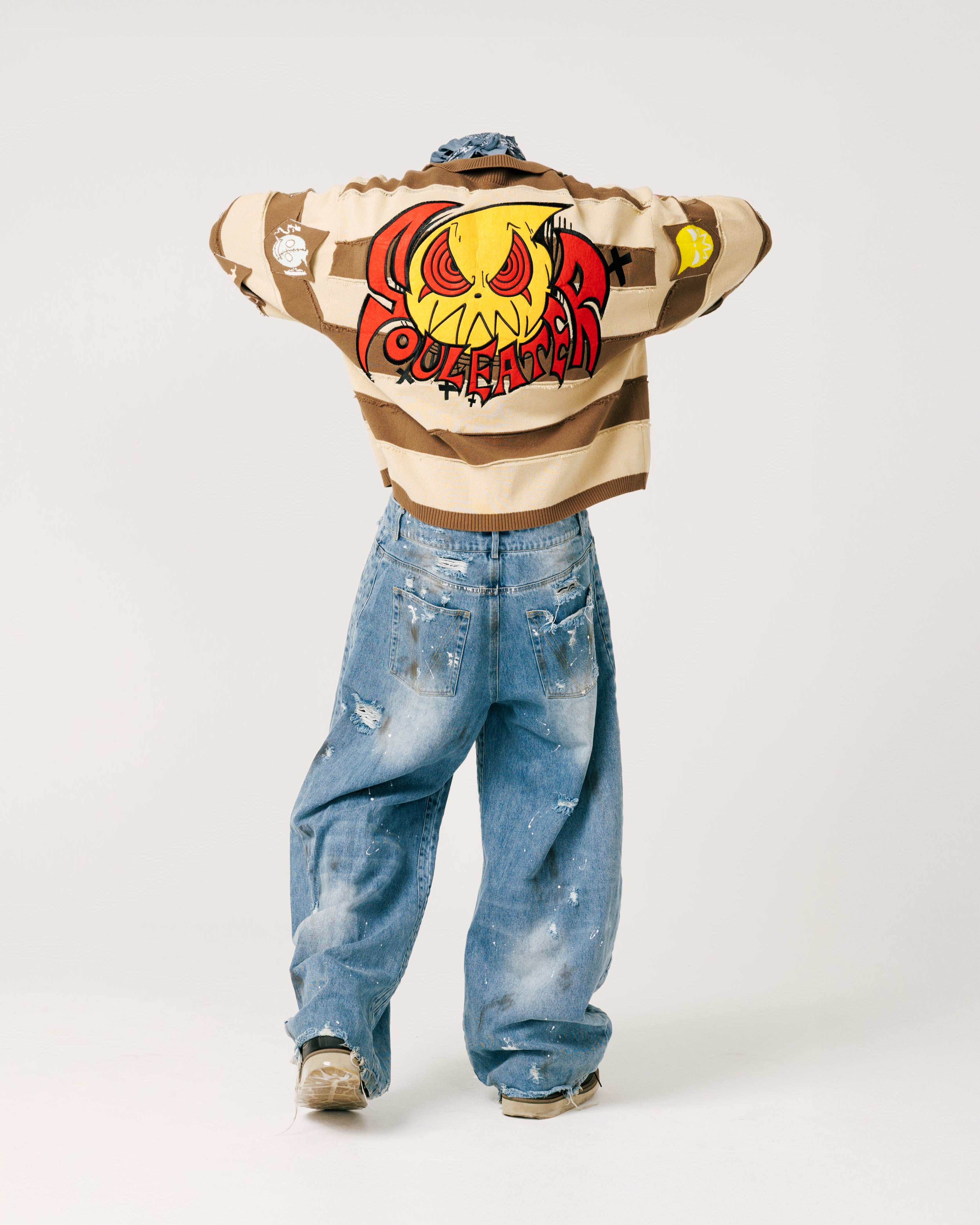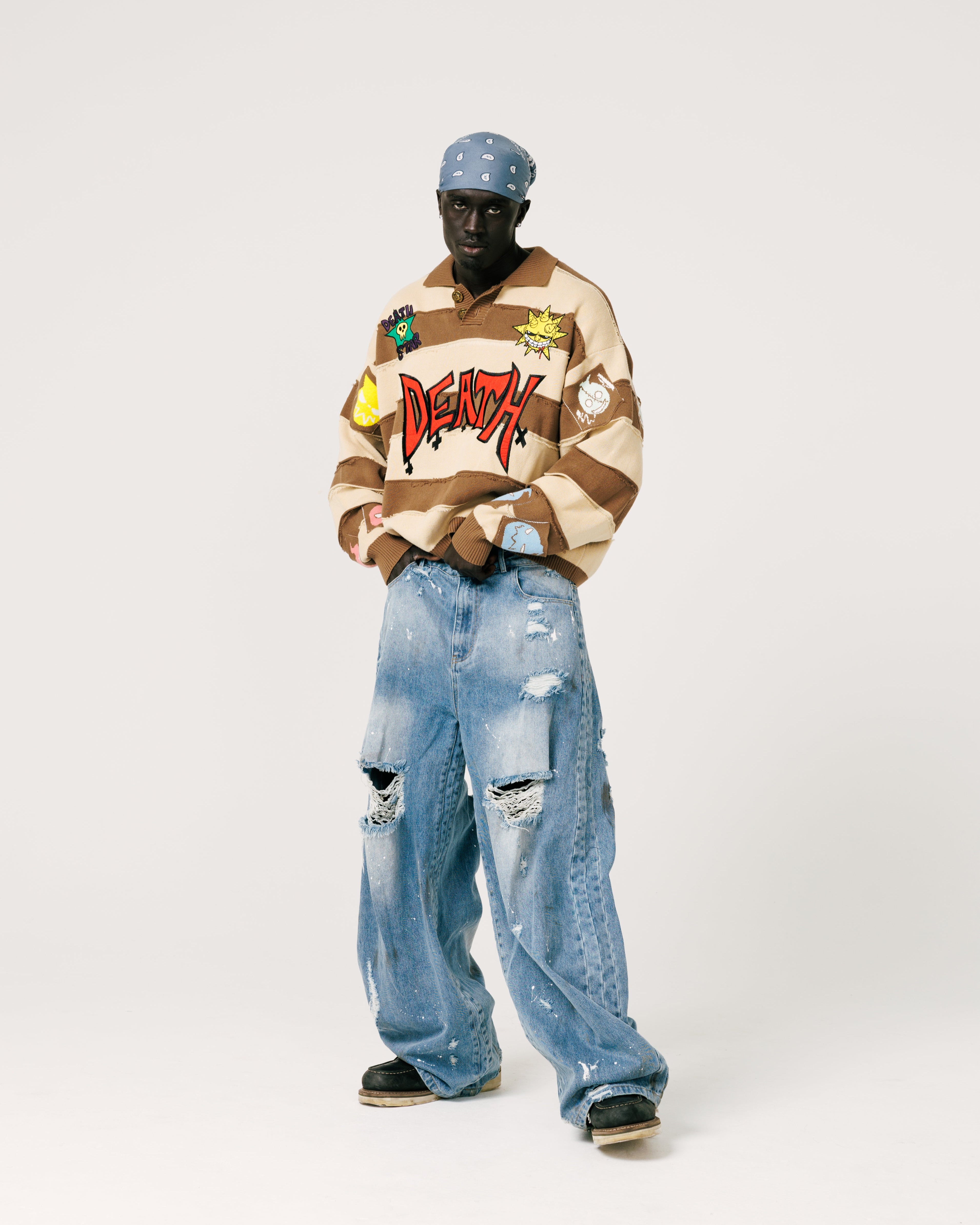 - Distressed fringed stripes,