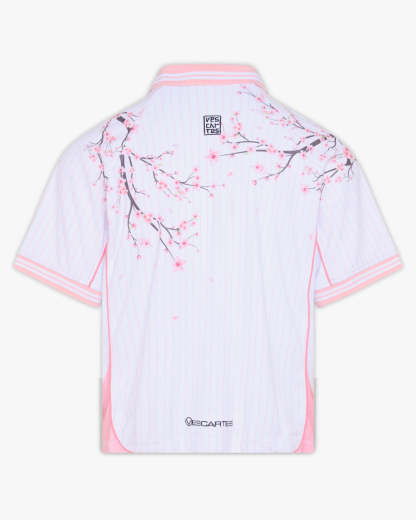 Features fine pink pinstripes running across all panels and printed cherry blossom branches running down from the shoulders over the front and back. contrasted by a pastel pink collar and sleeve trim. Finished with embroidered 'Vescartes' brand logos on the front and back.