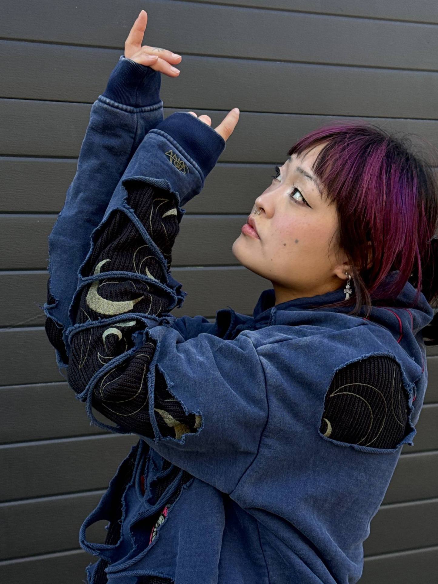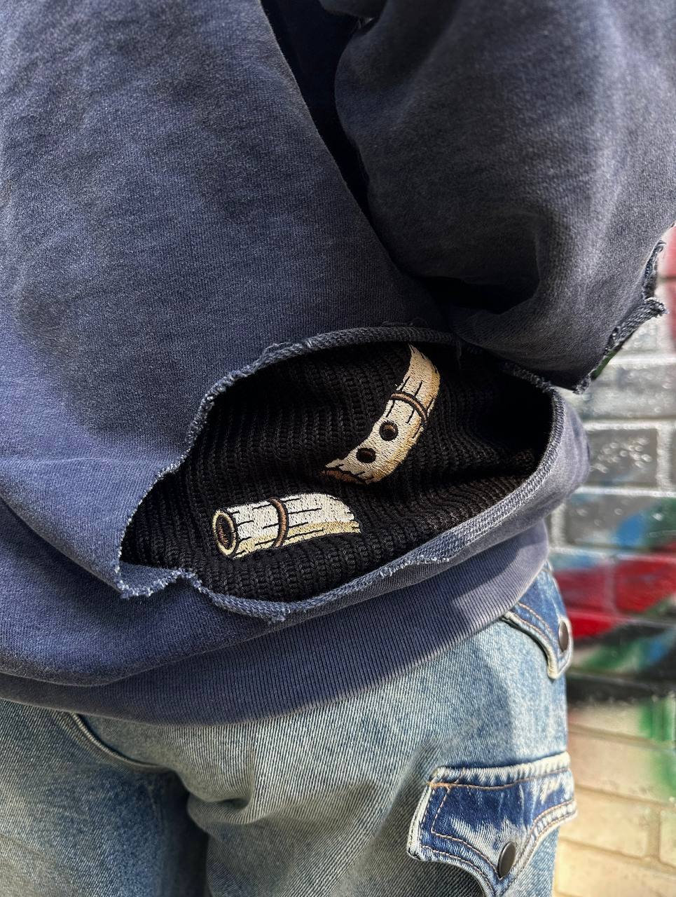 This is our hoodie made of two layers: black knit underneath, made of 100% cotton, and the top layer made of washed and thick French terry. The designs on the hoodie are embroidered on both sides to ensure the quality lasts forever!