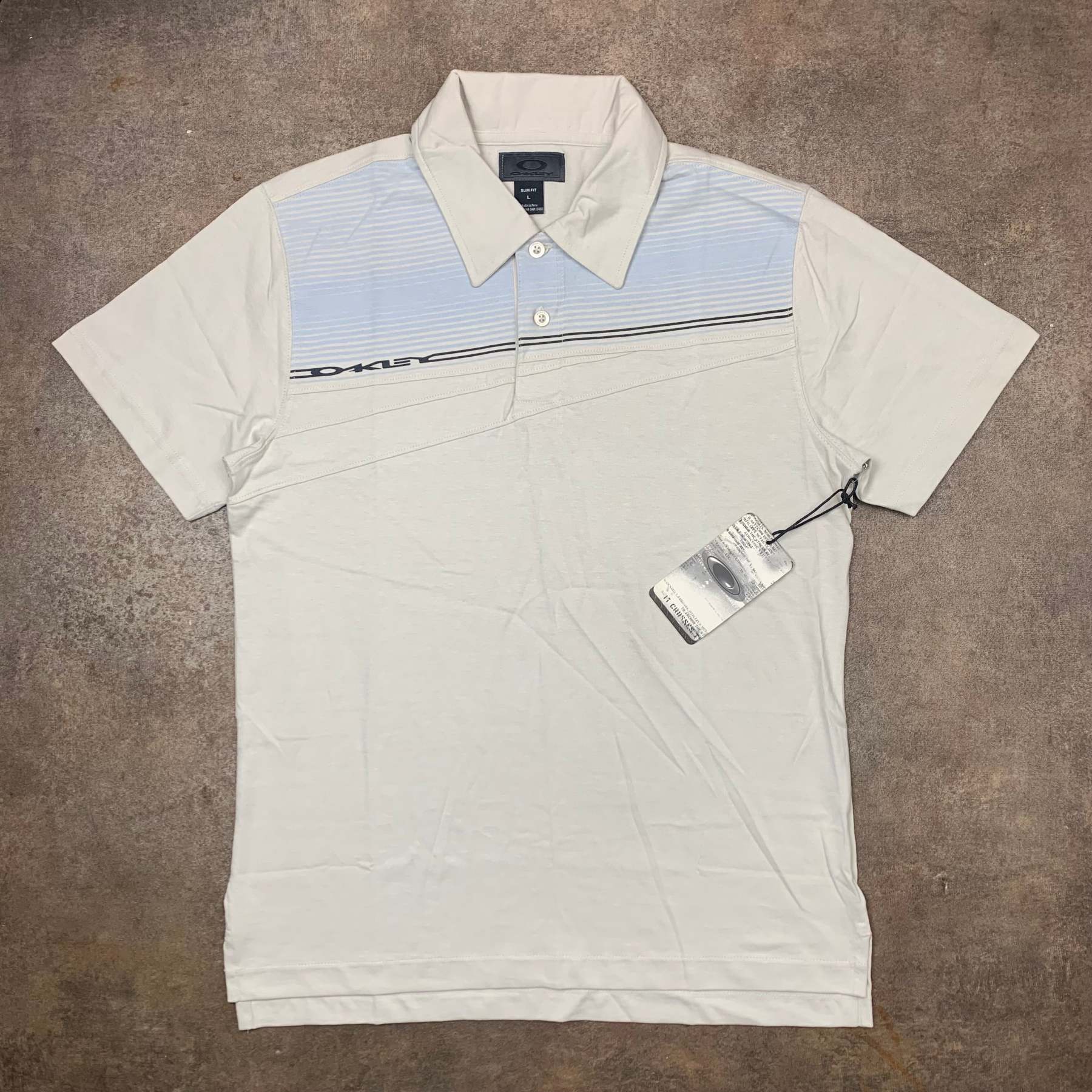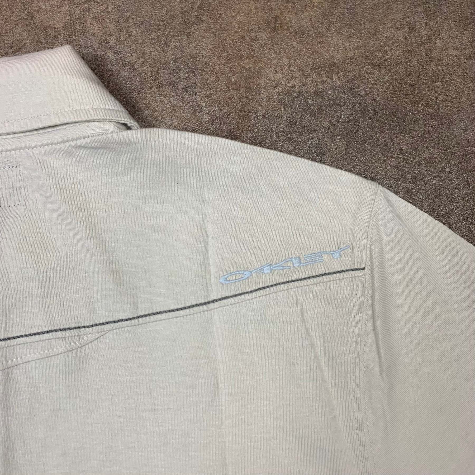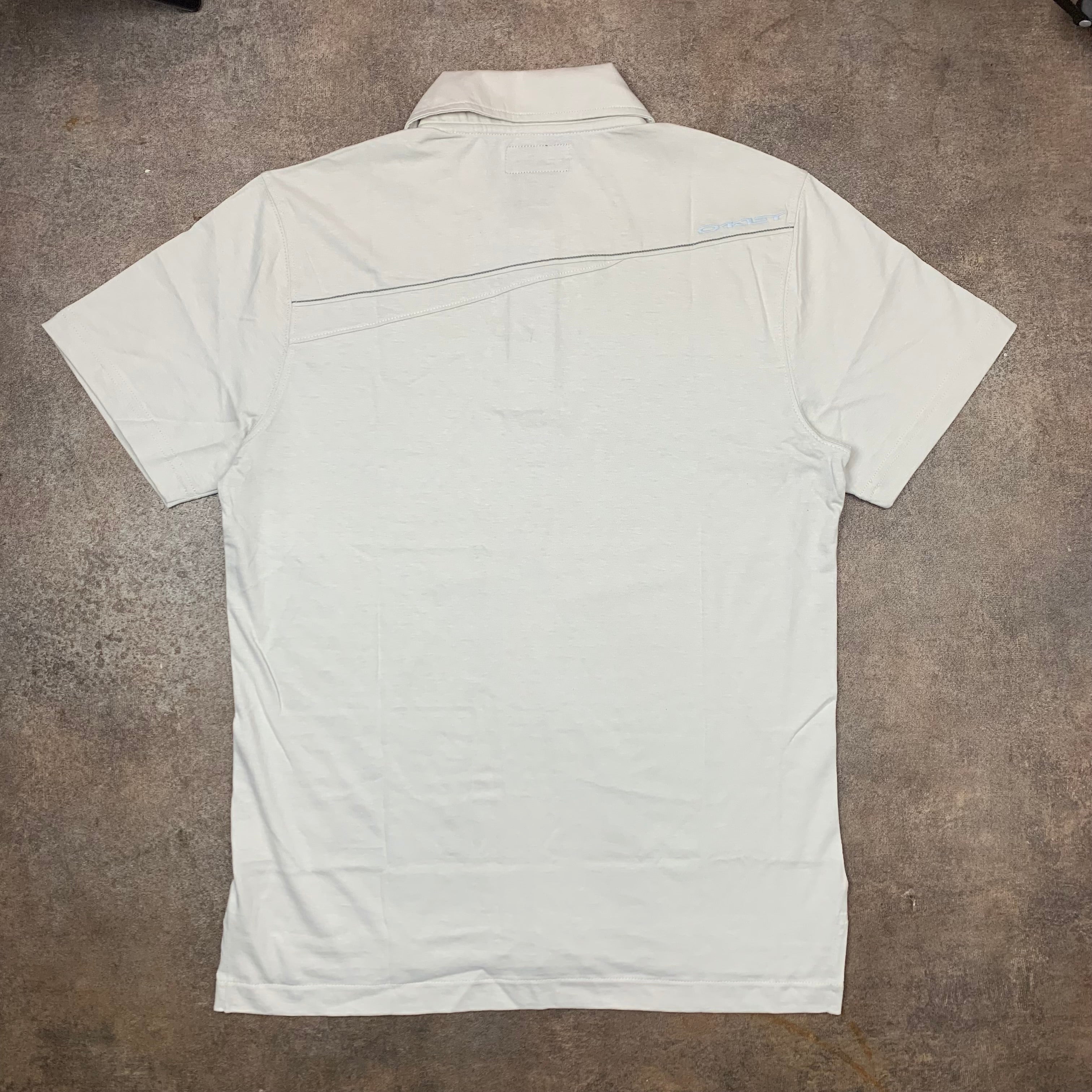 Vintage Oakley polo with embroidered spell out logos front and back, a print across the top of the front, cut and sewn panelling on the torso, coloured off-white all over and brand new with tags.