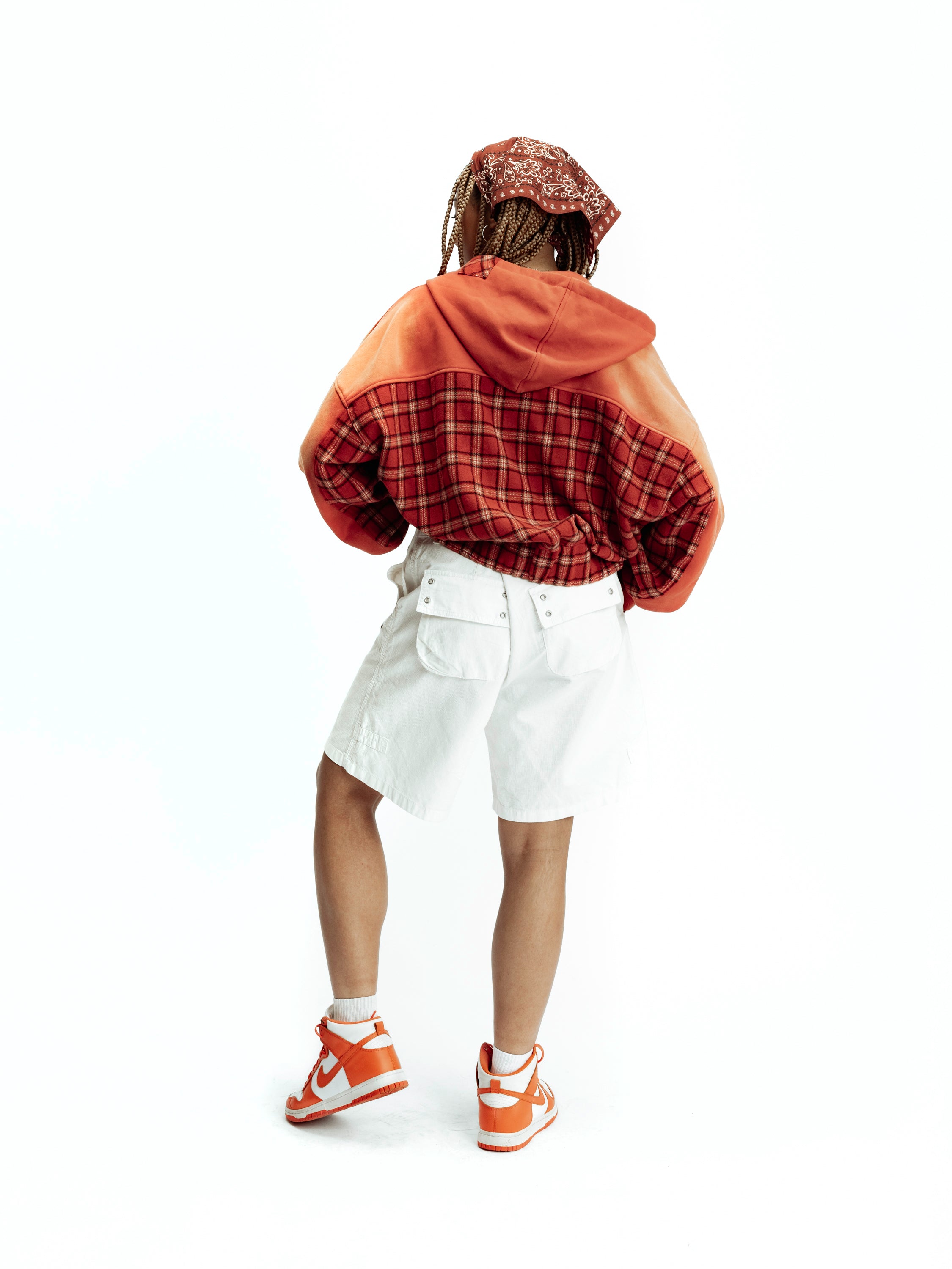 Inspired by the red coat of the Humanoid typhoon. Features two different splices of Cotton fabric and Wool flannel. Front distressed patchwork to rep the cult classic.