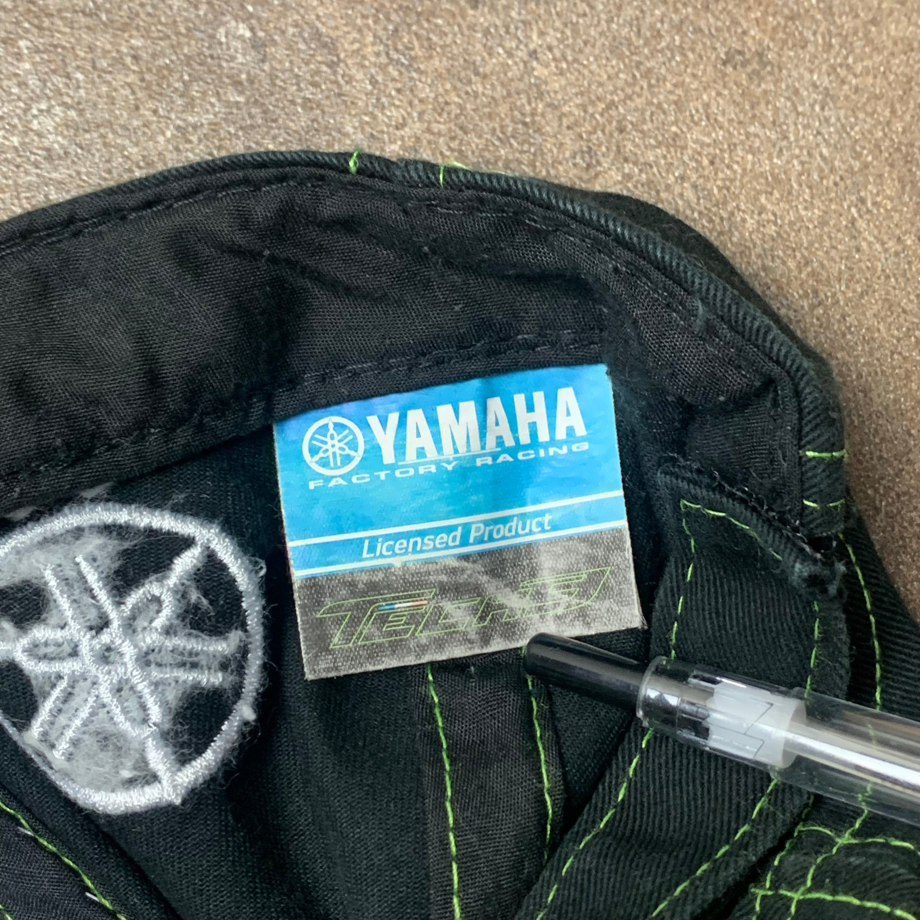 Vintage Monster Energy x Yamaha cap with embroidered graphics on the brim and front panels, printed yamaha logos, coloured black with monster green / white accents and in excellent second hand condition with creasing as shown, easily fixable.