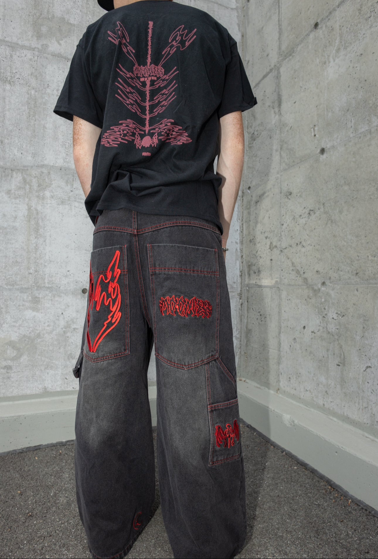 RED LOVELESS DOUBLE KNEES CARPENTER WIDE-LEG DENIMS.