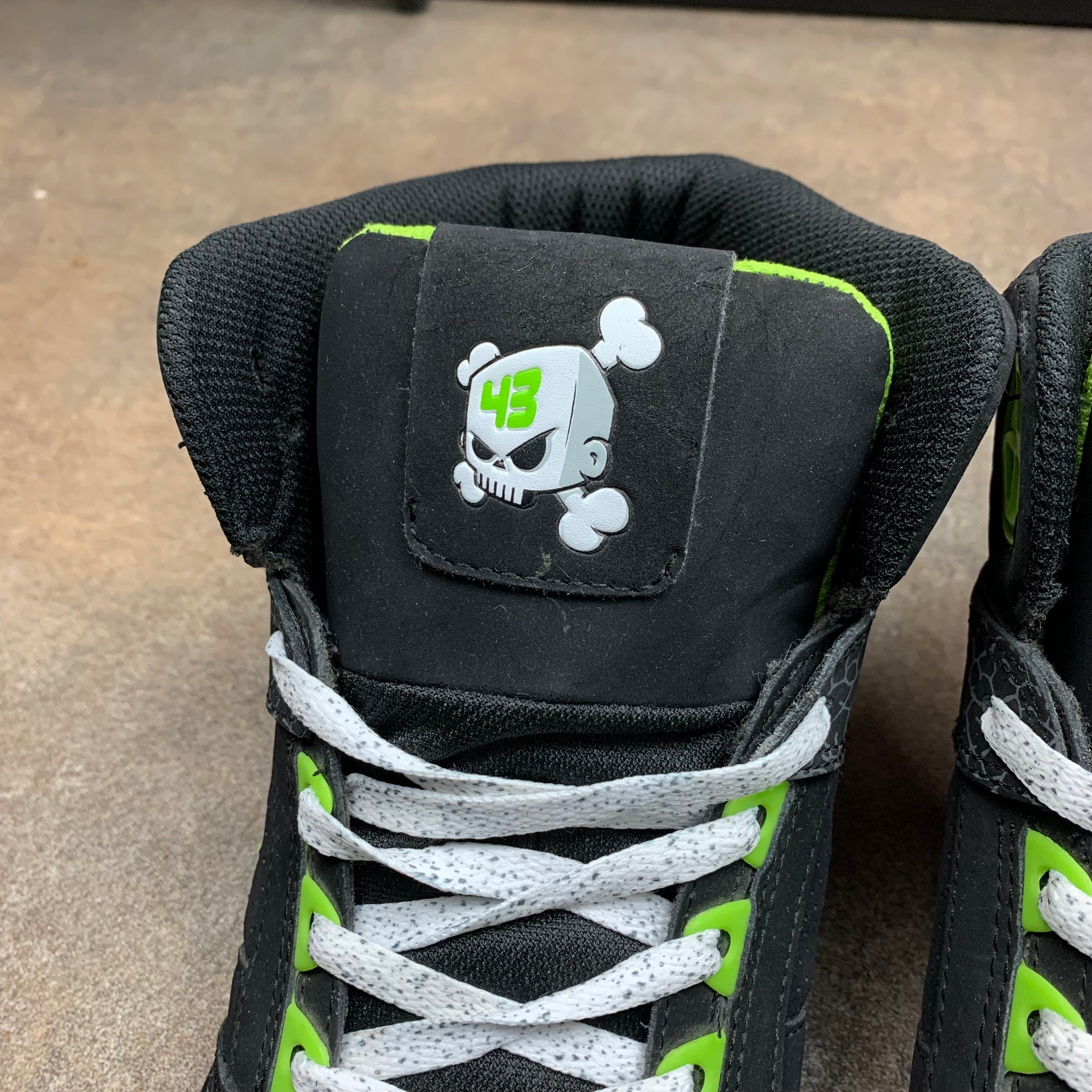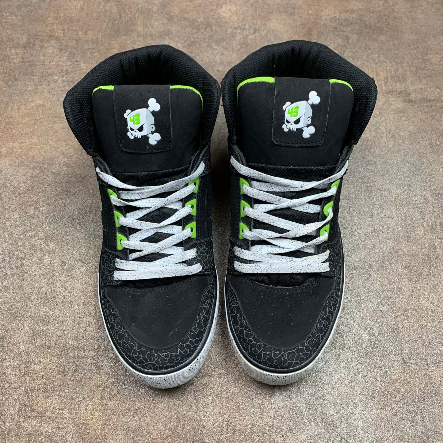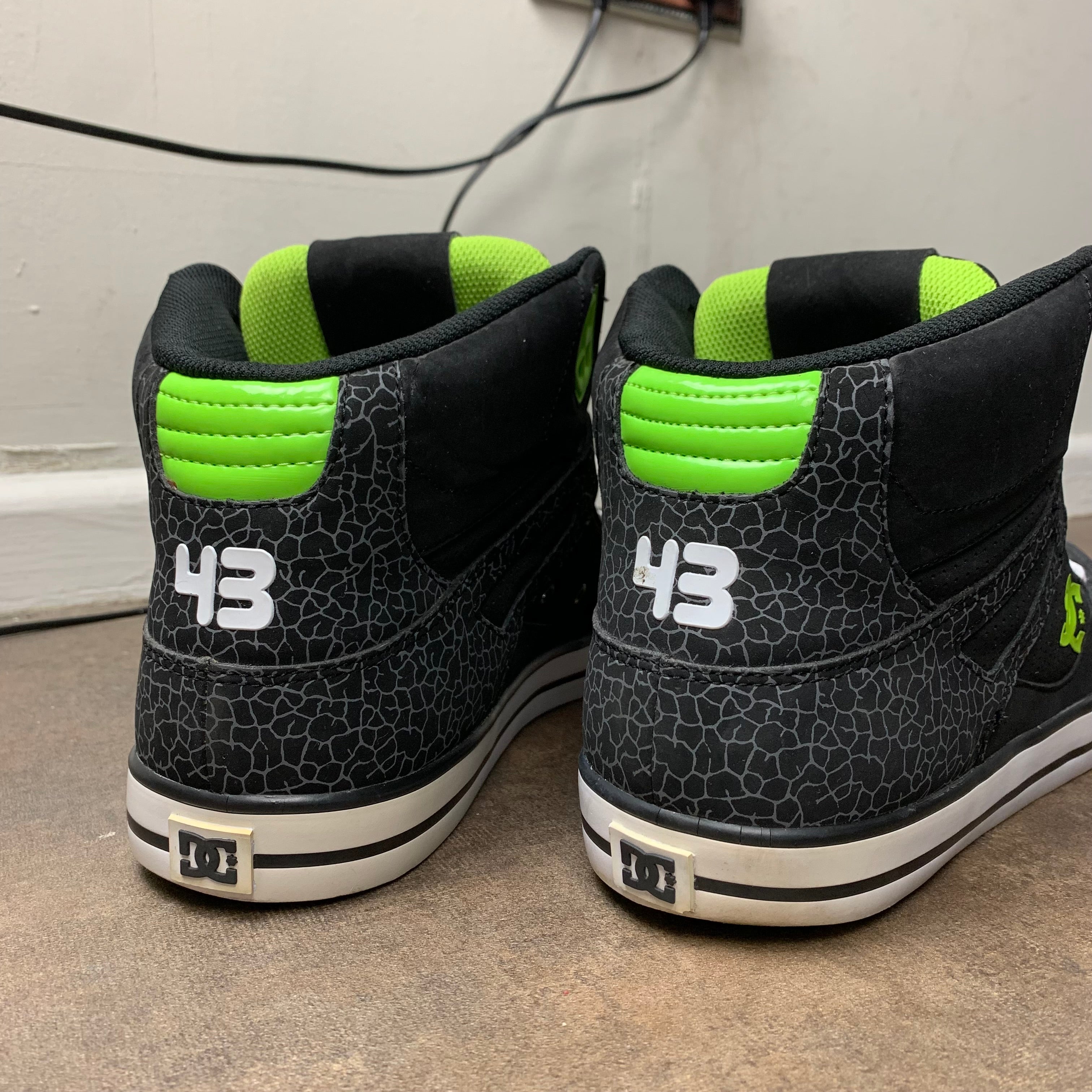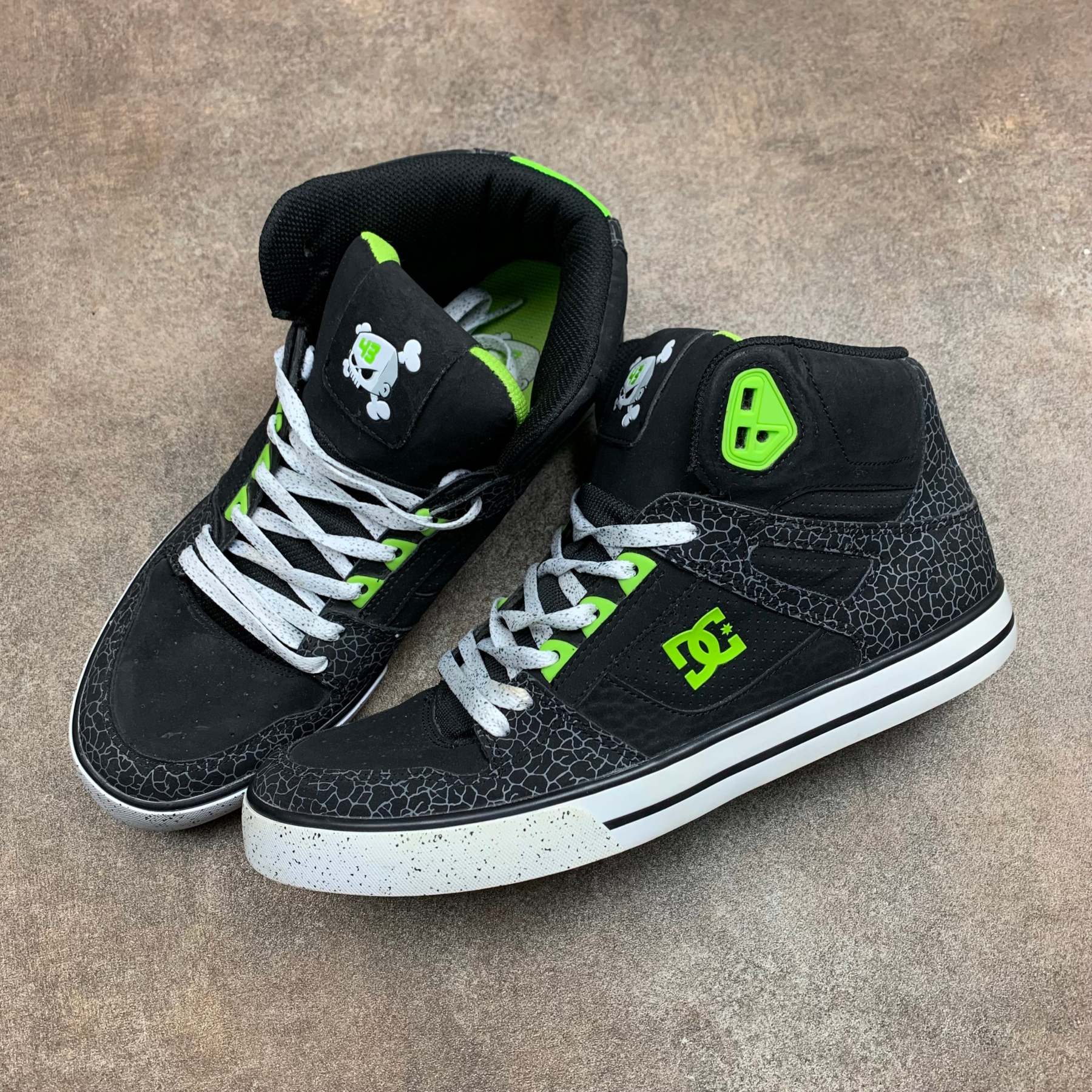 Rare DC Shoes x Ken Block high tops with skull logos on the tongues, green big star logos on the outsides, zebra skin / spotted detailing and in excellent second hand condition with little to no wear.