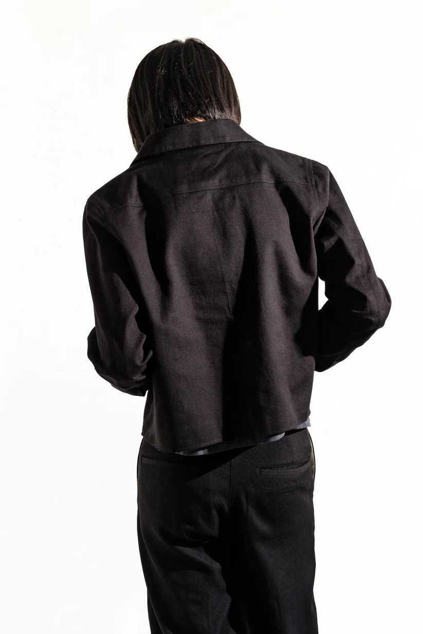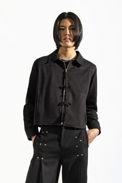 The Hanamusubi Jacket features a minimalist exterior with a striped Cupro lining, inspired by the Edo period philosophy of Uramasari.