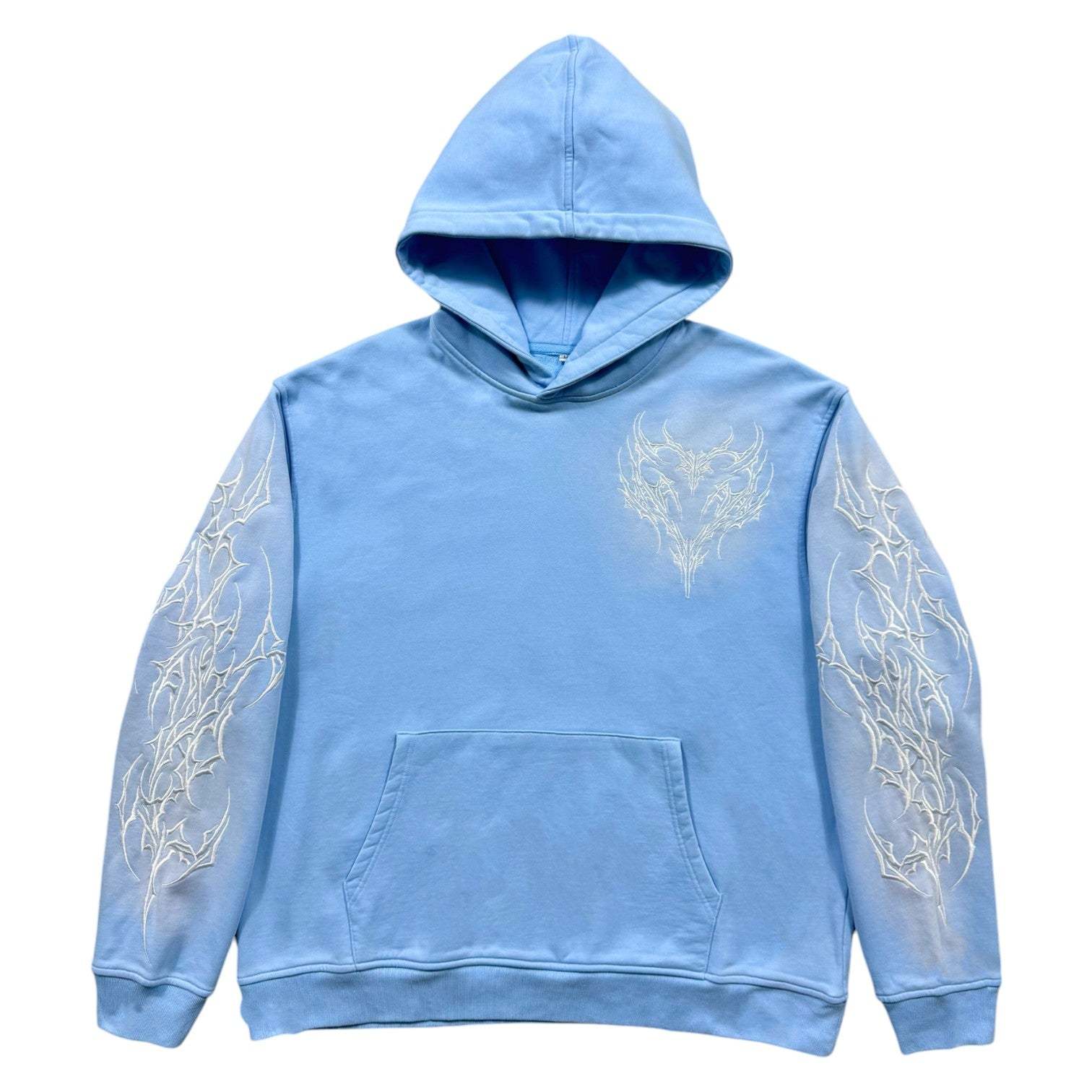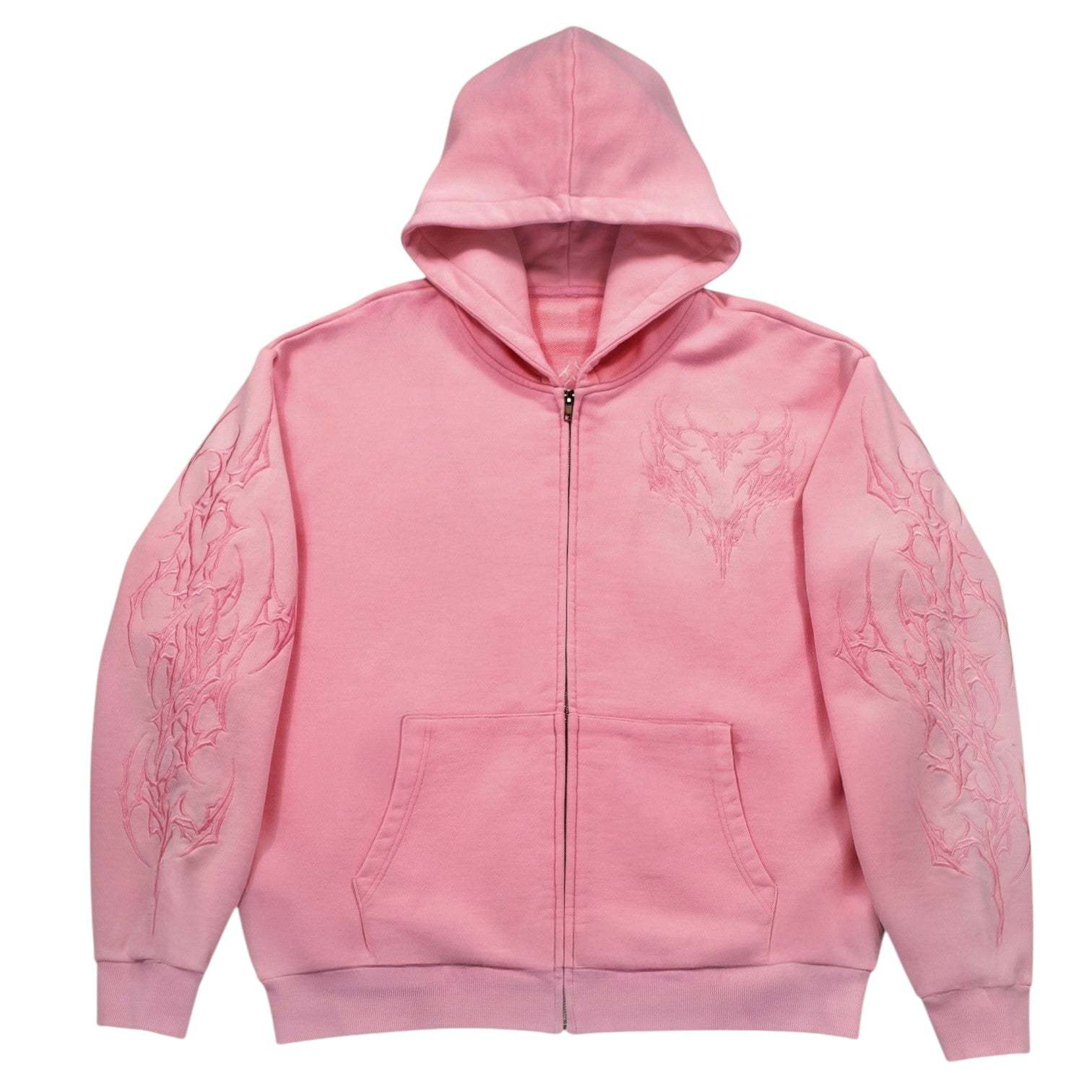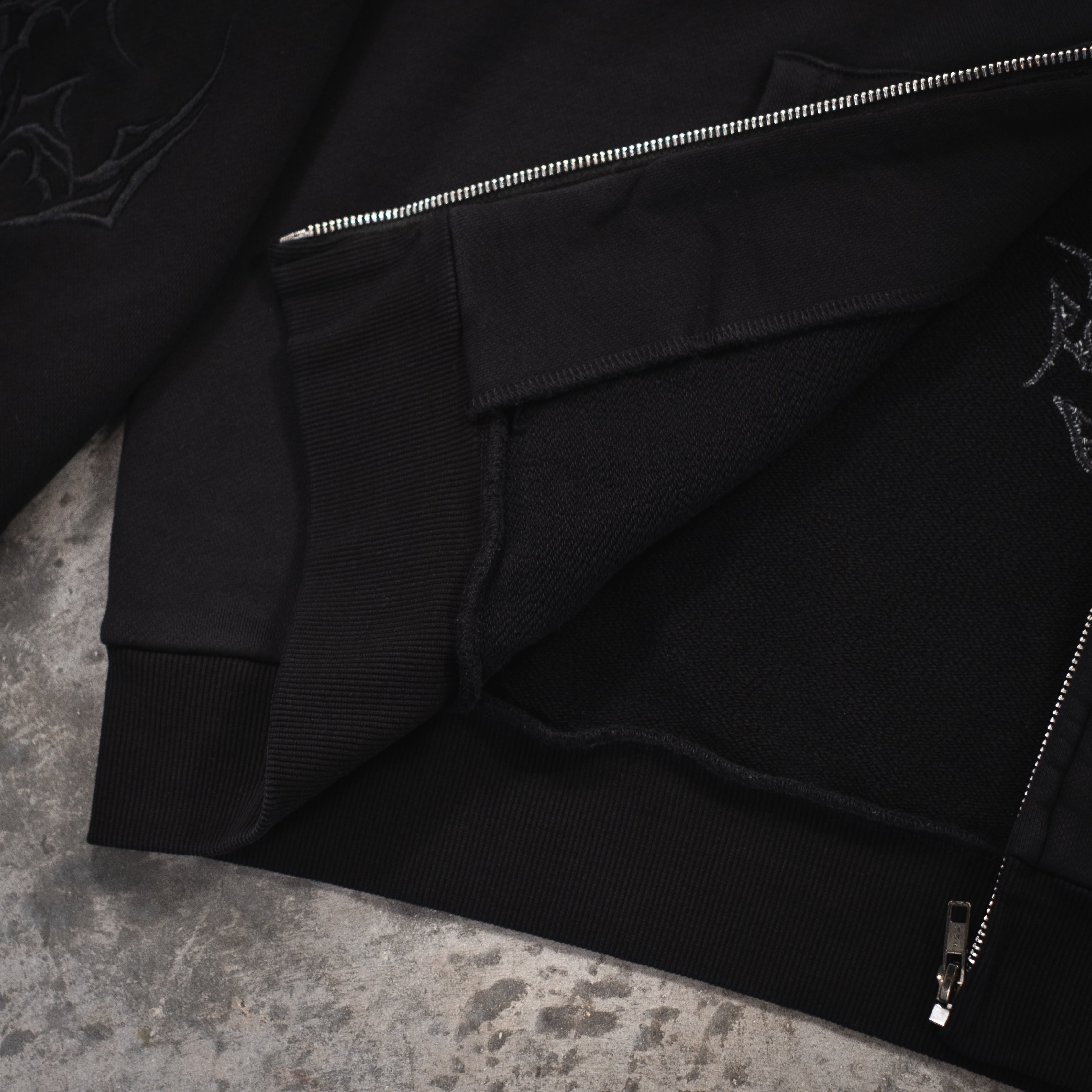 • Front, sleeve, and back tonal embroidery