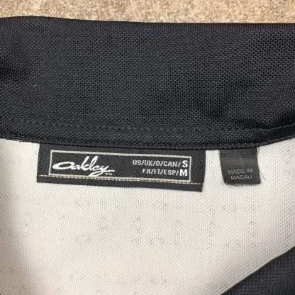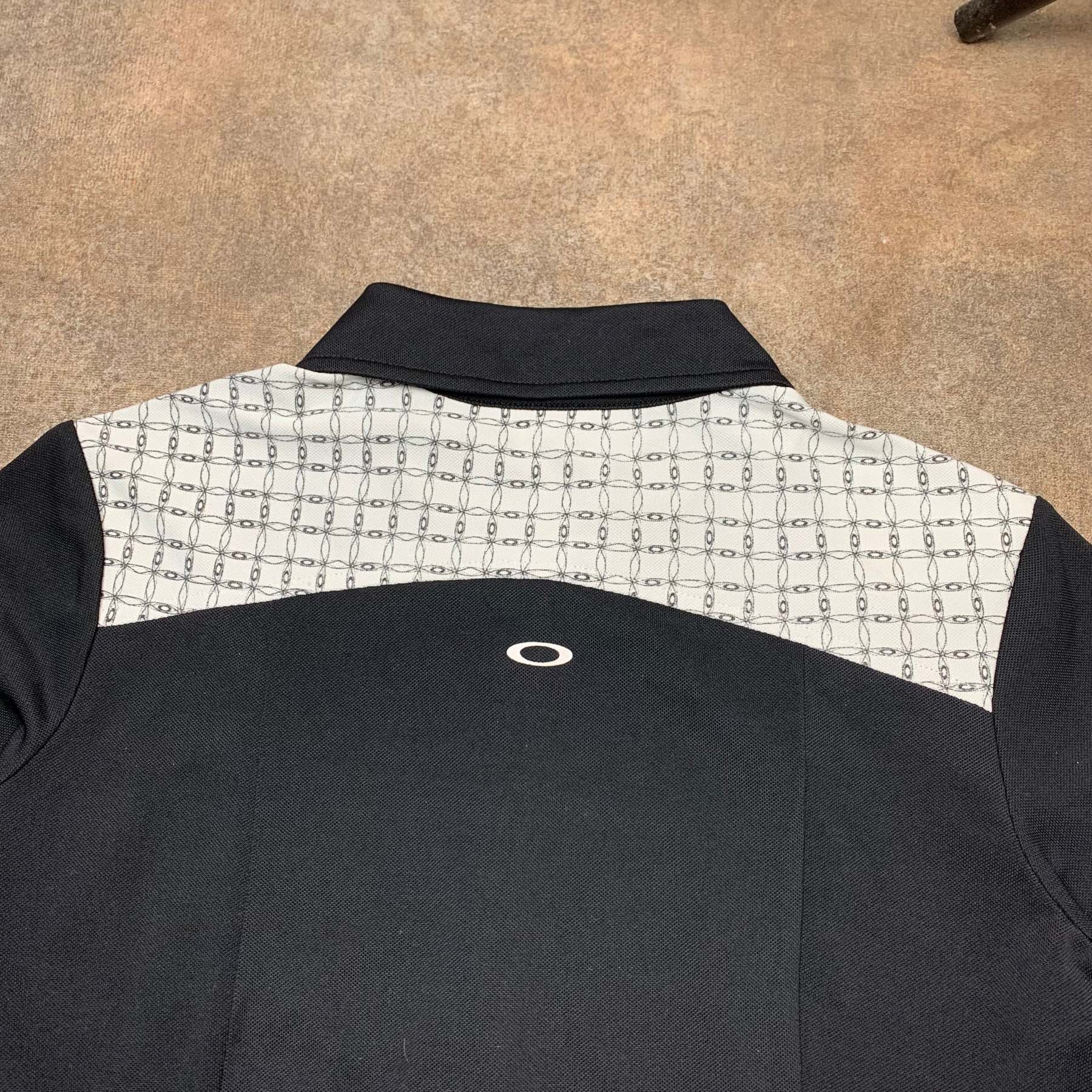 Vintage Oakley shirt with a repeated Oakley pattern detailed on the panel around the top / in the pleats, coloured black with white accents, printed O logos on the front and back and in excellent second hand condition with little to no wear.