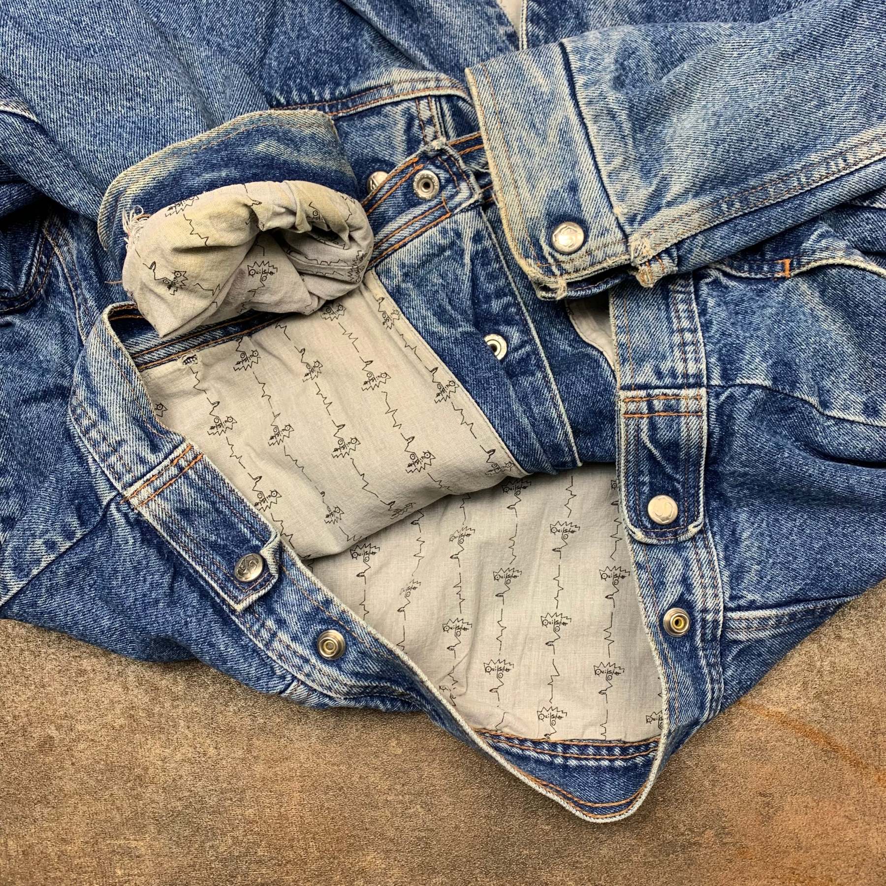 Super rare Quiksilver jacket from 1989 / the Used and Abused line with a cut and sewn Tom Carroll graphic on the back, waist buckles, branded buttons, an embroidered logo on the front, repeated graphic lining throughout the inside and in excellent second hand condition for an item this old with small stains on the right sleeve / front as shown and general wear.