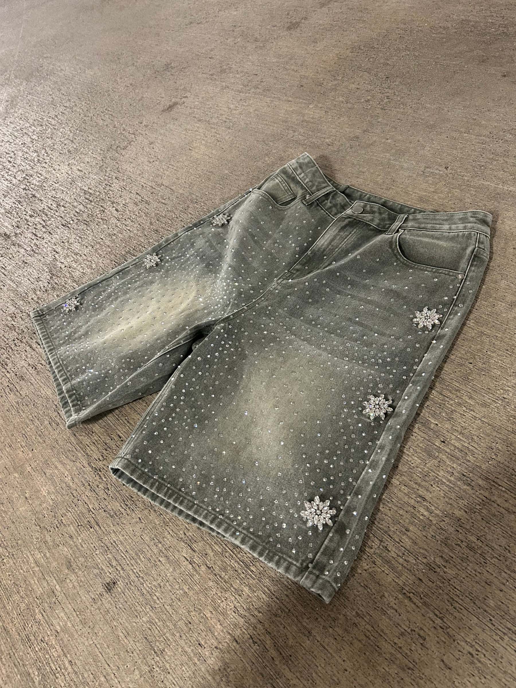 These 18oz denim jorts are fully flooded with rhinestones for a bold, dazzling look.