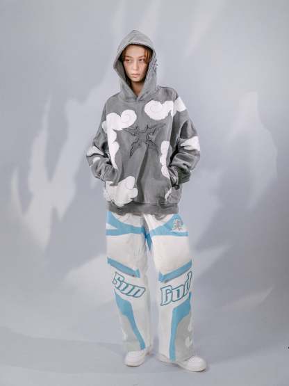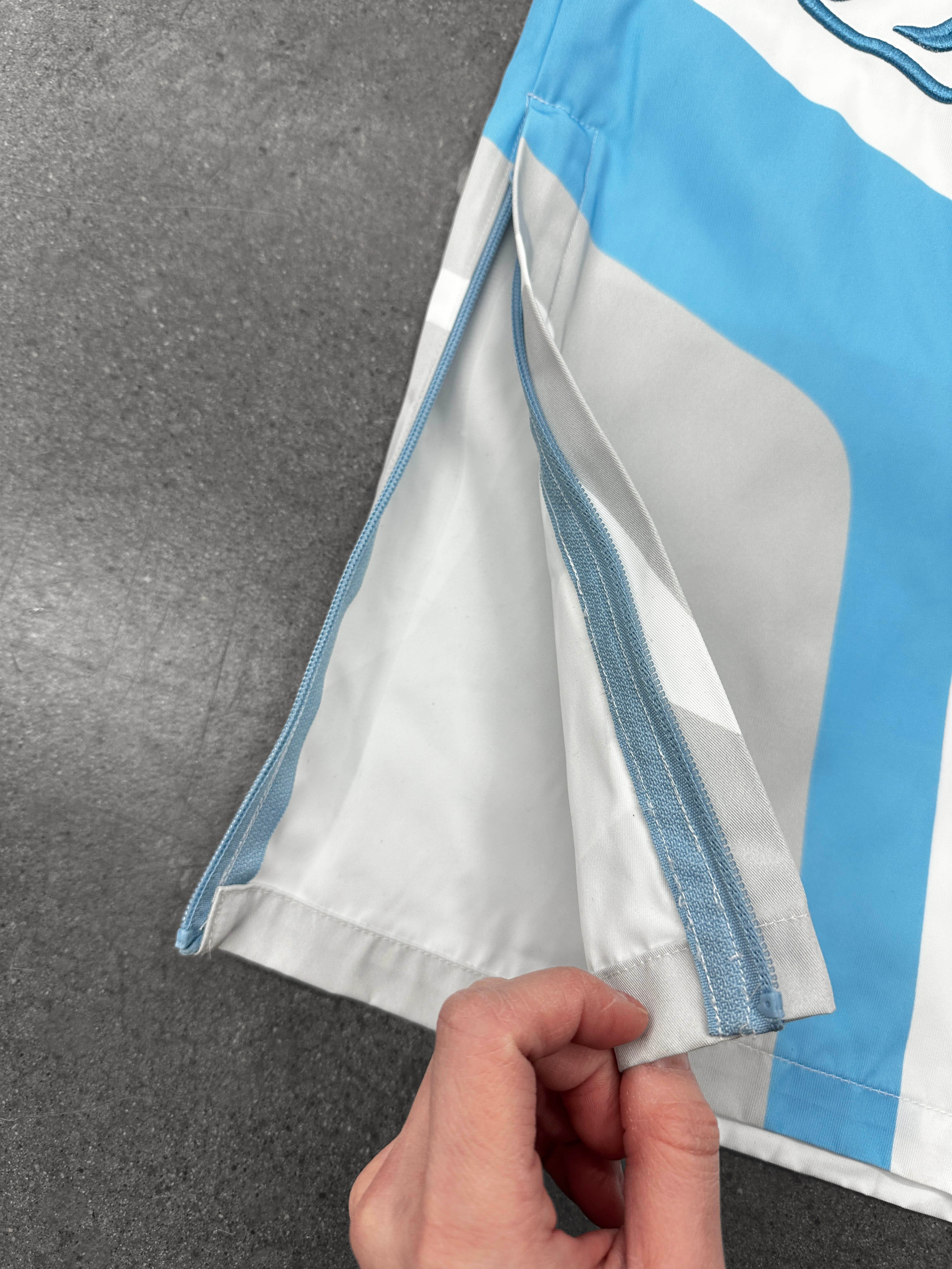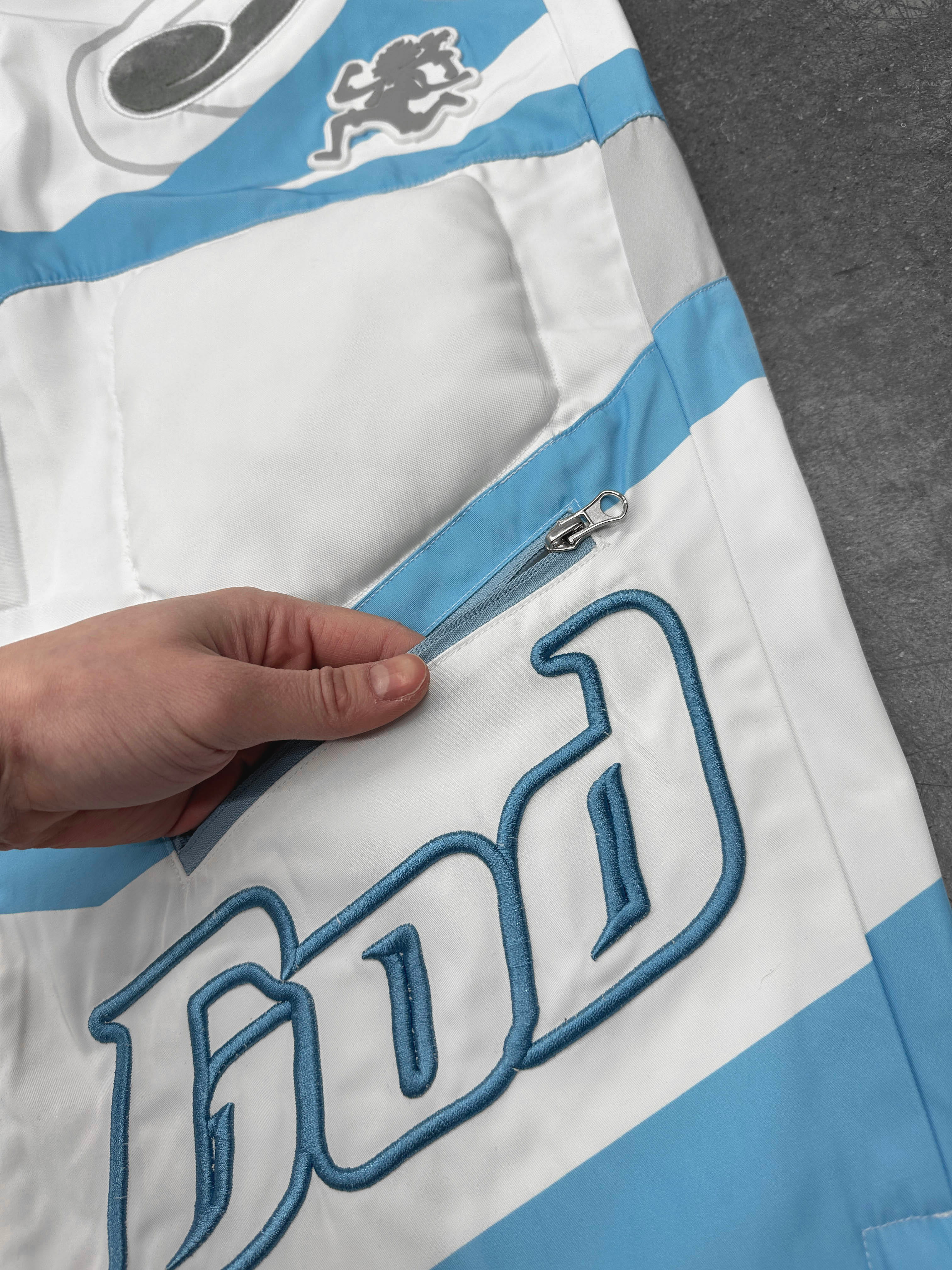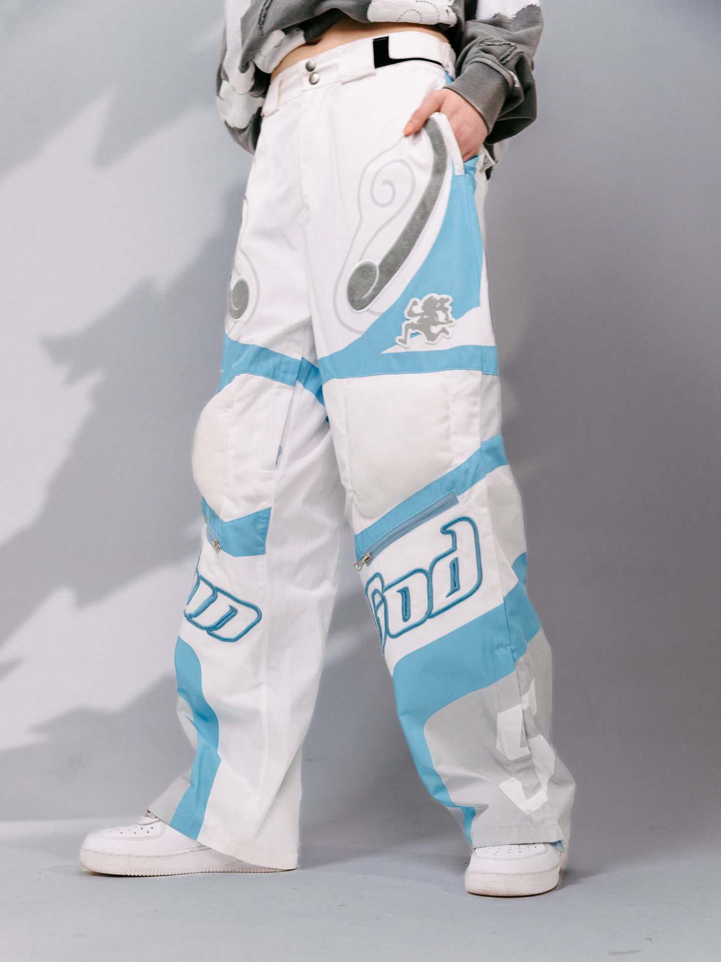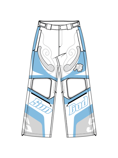 Heavy-duty ski pants made from water-resistant polyester with printed color blocking that cuts through the silhouette. Fully lined for structure, with an elastic waistband, side zip pockets, and inner thigh zip vents with mesh for controlled airflow. Padded knees add form and protection, while fuzzy embroidery at the thigh contrasts against a raised 3D SUN GOD embroidery. Zippered leg openings allow the shape to shift depending on how they’re worn.